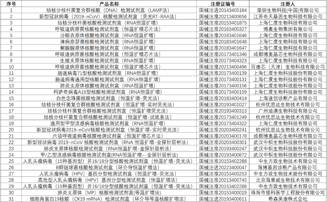 (一)恒温扩增试剂 NMPA共批准了31款试剂盒,境内产品占主要,具体数据见图15,涉及17家公司,具体数据见表6。这31款产品中有30款是病原微生物检测相关试剂,这也符合其技术特点。