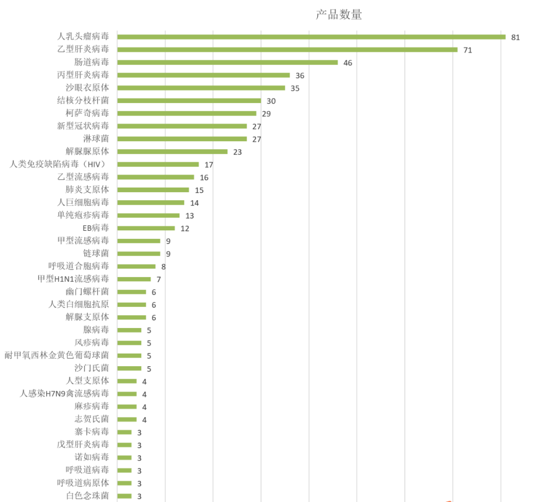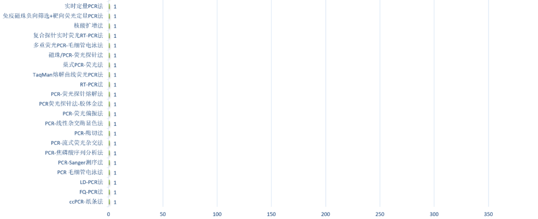 PCR类试剂盒中,有的直接采用PCR进行分析,有的是PCR结合其他方法一起分析,上述的848个PCR类试剂盒中共涉及了53种方法学(根据试剂盒名称获得数据),具体数据见图9。