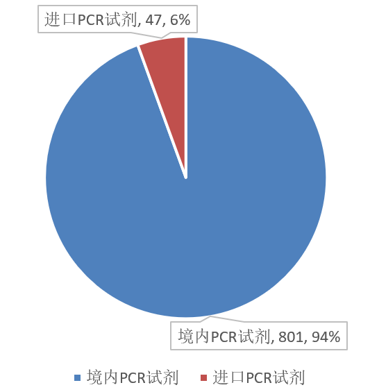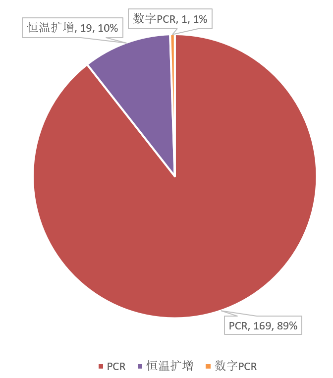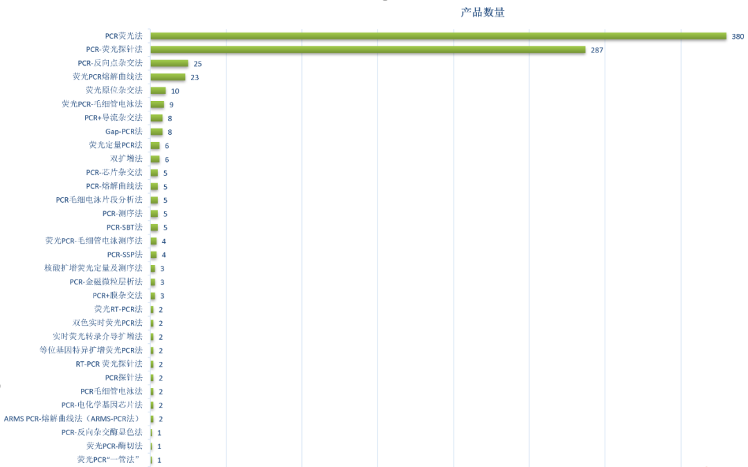 图9 PCR试剂盒方法学分布 备注1:荧光PCR法包含:PCR多色荧光法、PCR荧光法、多重实时荧光PCR法、多重荧光PCR法、实时荧光PCR法、荧光PCR法、荧光PCR染料法、荧光染料PCR法和荧光探针PCR法; 备注2:有些试剂盒的方法原理可能一样,只是试剂盒中名称表述不一,上述分类可能会存在把其分在不同类别的情况(根据产品名称进行判断,会存在不足的地方)。