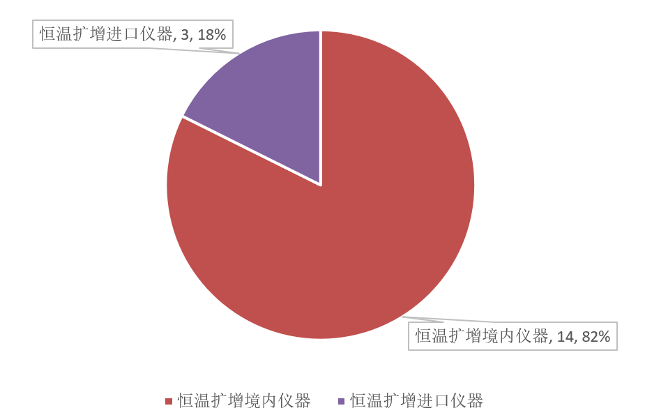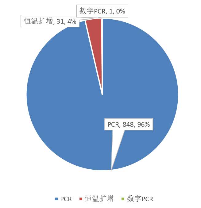 图1 核酸扩增仪器分布图 图2 核酸扩增仪器公司分布图 图3 核酸扩增试剂盒分布图 图4 核酸扩增试剂盒公司分布图 由于PCR类、恒温扩增类和数字PCR类等产品有较大的差异,后续会对该三类产品进行分开统计分析,以便能更全面的展示核酸扩增类产品的现状。