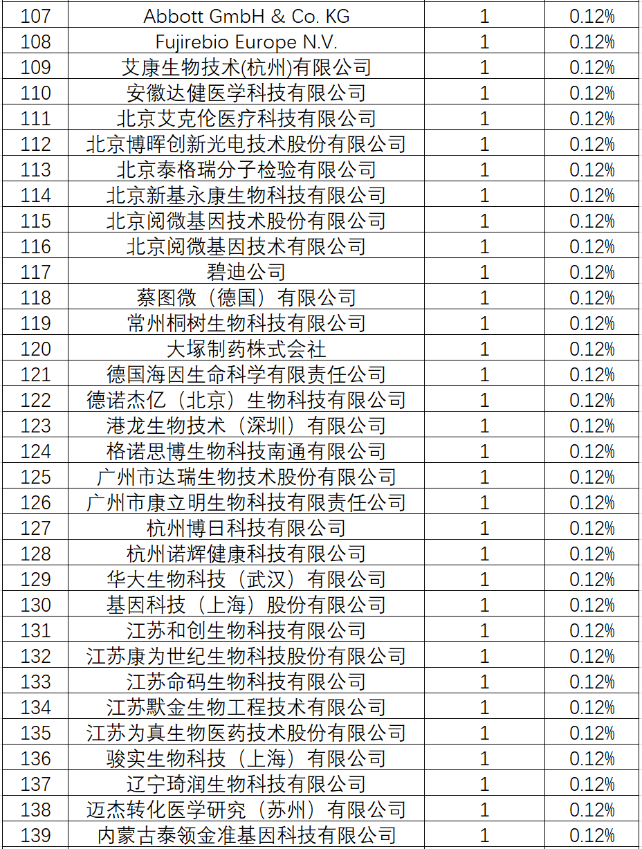 三、数字PCR 它是一种核酸分子绝对定量技术。相较于PCR,数字PCR能够直接数出DNA分子的个数,是对起始样品的绝对定量。数字PCR发展较PCR晚一些,截止到今天,共23款仪器获证,涉及16家公司,只有一款试剂盒获证,具体数据见表9。数字PCR领域,全部都是国产仪器(境外公司还没有直接入场)。