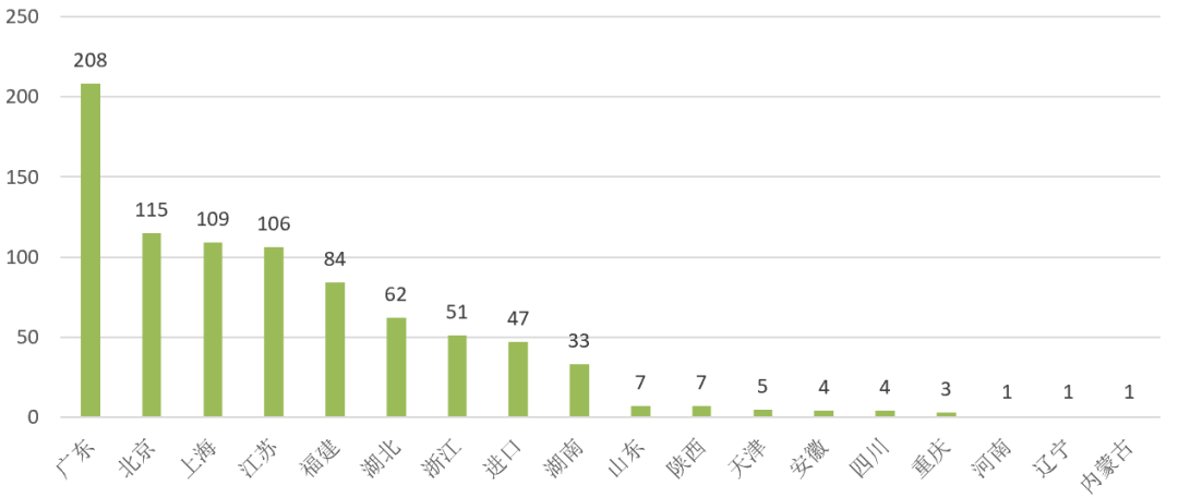 获证公司主要集中在经济发达省份,其中,浙江、江苏、福建、北京、广东是获批产品排前五名的省份(该处进口不排名),具体数据看图14。 图14 PCR仪器省份分布