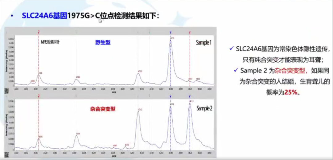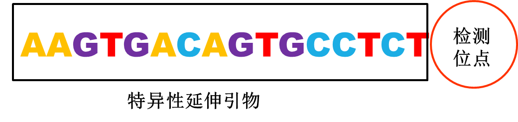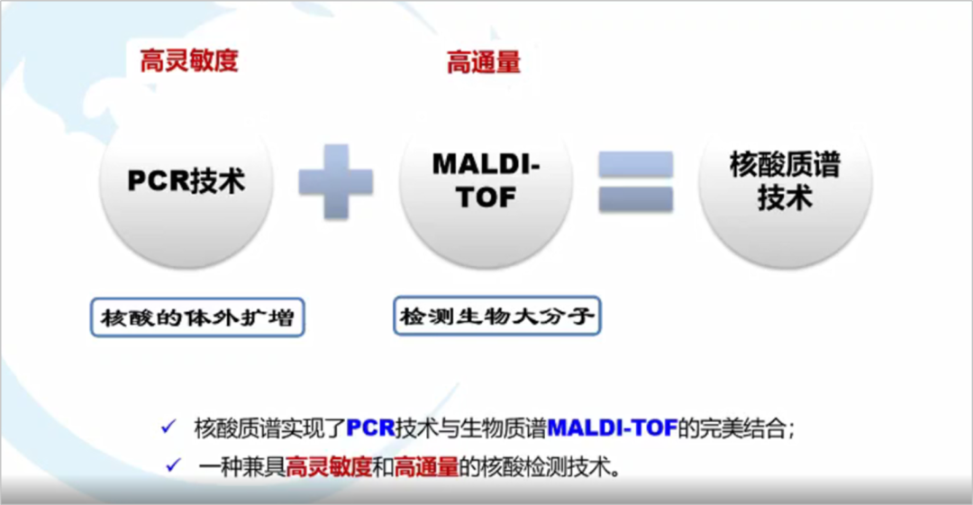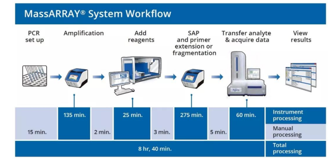 Part. I 简介 核酸质谱,顾名思义是一种能检测核酸的质谱技术,该技术主要通过多重PCR+高通量芯片+飞行时间质谱来实现核酸检测。 目前核酸分析所使用的质谱电离技术主要还是采用电喷雾电离(ESI)和基质辅助激光解析电离(MALDI)。ESI 检测的特点是生物大分子带多个电荷,质荷比范围基本在2000 Da 以下区间,从而能检测几万乃至更大的生物分子;而MALDI常得到单电荷峰,与飞行时间(TOF)分析器搭配,检测范围可以到几十万道尔顿。它是基于MALDI-TOF MS质谱发展起来。 20世纪80年代出现的基质辅助激光解析电离飞行时间质谱(MALDI-TOF MS)打破了以往质谱仅可进行小分子物质分析的传统,使得核酸、蛋白质等生物大分子也可应用质谱进行研究,极大推进了基因组学、蛋白质组学的发展,并且给生物领域及医学领域带来了革命性的突破。 ▲图|核酸质谱技术(来源:网络图片) 2. 核酸质谱检测原理 MALDI-TOF MS检测核酸主要分为如下步骤: 根据待检测位点设计上下游引物,以样本DNA为模板,进行PCR扩增反应,获得目标位点的PCR产物片断。 2、虾碱式磷酸酶处理 然后加入虾碱式磷酸酶(SAP),对PCR产物进行去磷酸化反应,消除反应体系中剩余的引物和dNTP。 3、设计特异性延伸引物,进行单碱基延伸反应 经过SAP消化后的PCR产物,加入一条单碱基延伸引物以及ddNTP(ddNTP替代dNTP作为原料,在引物后面延伸一个ddNTP终止),进行单碱基延伸反应,获得延伸产物。 ▲图|根据检测序列设计的特异性延伸引物(来源:分子生物应用) 4、树脂纯化 加入脱盐树脂,对延伸产物进行脱盐纯化,避免离子在质谱中对待测样本的影响,消除盐峰干扰。 5、样品与基质结合 使用芯片点样仪将树脂纯化后的样本点到带有基质的芯片上,干燥后放入质谱仪中。 6、与基质结合的样本在激光照射下获得能量,进而离子化开始在真空管中飞行,最终到达检测器,获得核酸物质检测峰。 结果展示示例 3. 核酸质谱操作流程 ▲图|MassARRAY®系统操作流程(来源:Agena Bioscience) 4. 核酸质谱特点