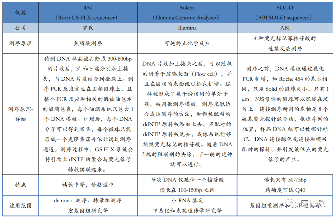 目前高通量测序的主要平台代表有罗氏公司(Roche)的 454 测序仪(Roch GS FLX sequencer),Illumina 公司的 Solexa 基因组分析仪(Illumina Genome Analyzer)和 ABI 的 SOLiD 测序仪(ABI SOLiD sequencer)。