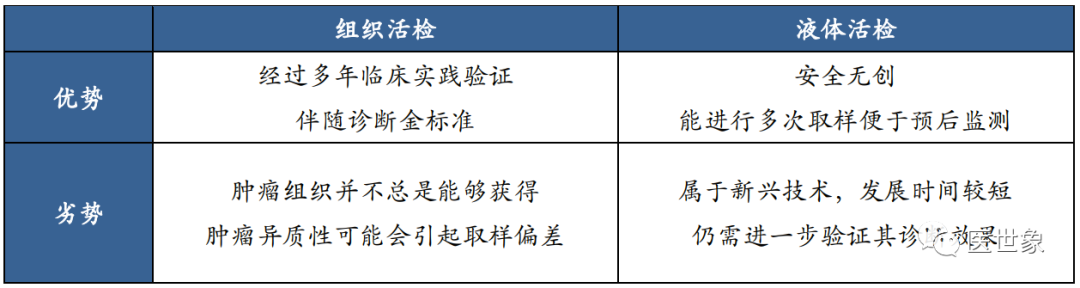 伴随诊断需要通过对样本进行基因测序等分析手段进行药物受体作用位点的确定,目前常用样本类型为组织以及体液。对组织进行分子分析的技术称为组织活检,具体是指应诊断、治疗的需要,从患者体内切取、钳取或穿刺取出病变组织,对其进行分子分析。对肿瘤伴随诊断来说,肿瘤组织活检是获取肿瘤 DNA 的金标准。对液体进行分析的技术称为液体活检,具体是指通过对患者的体液中的分析物(CTC、cfDNA、ctDNA 等)进行分子分析,以指导患者的个性化治疗及预后。