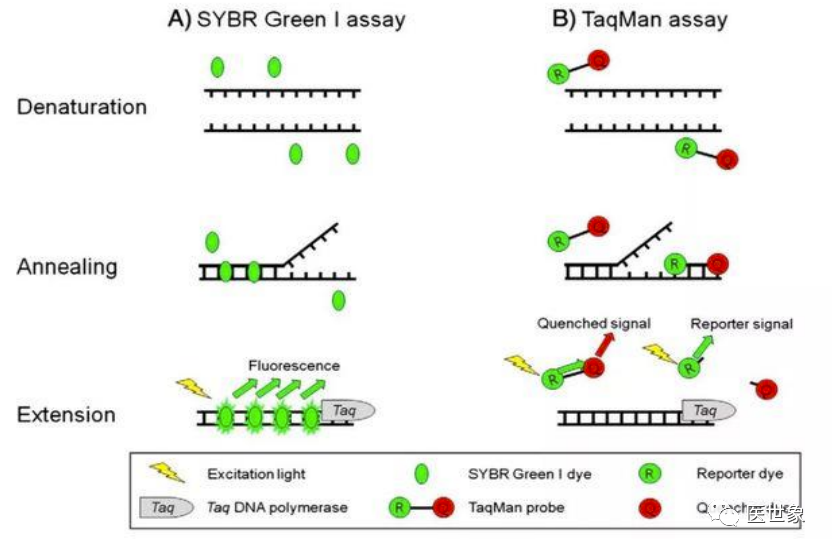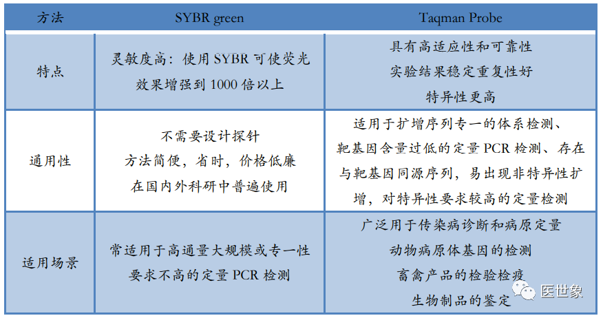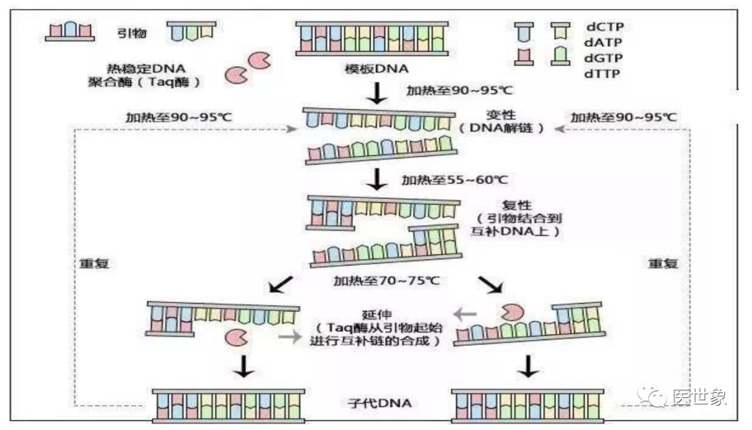 PCR(聚合酶链式反应)是一种用于放大扩增特定 DNA 片段的分子生物学技术,可以看作是生物体外的特殊 DNA 复制,其最大特点是能将微量的 DNA 大幅增加。在存在 DNA模板、引物、dNTPs、适当缓冲液 (Mg2+) 的反应混合物中,在热稳定 DNA 聚合酶的催化下,对一对寡核苷酸引物所界定的核酸片段进行扩增,这种扩增是以模板 DNA与引物之间的变性、退火、延伸三步反应为一个周期,循环进行,使目标 DNA 片段得以扩增。最初的普通 PCR 技术只能通过对靶基因进行扩增,然后采用琼脂糖凝胶电泳对产物进行分析,实现简单的定性分析,这是第一代 PCR。鉴于(1)第一代 PCR 采用的核酸燃料对实验人员及环境造成较大伤害,(2)PCR 完成之后开盖检测易污染造成假阳性结果,(3)检测耗时长且操作麻烦易出错及(4)只能做定性检测,二代 PCR 得以发展 并成为目前国内 PCR 技术主流。第二代 PCR 就是荧光定量 PCR 技术(Real-Time PCR),也叫做 qPCR, 是指通过应用荧光染料或荧光标记的特异性探针(如 Taqman Probe),在 PCR 反应体系中加入荧光基团对聚合酶链反应产物进行标记跟踪,实时监控反应过程,结合软件对荧光信号 进行分析,实现基因检测的定性和定量分析。qPCR 常用于传染病病原体检测,疾病耐药基因研究,药物疗效考核,遗传疾病诊断。随着反应循环次数的增加,被扩增目的基因片段呈指数增长,通过实时检测对应的随扩增而变化荧光信号强度,求得 Ct 值,利用已知模板浓度的标准品作对照,即可得出待测标本目的基因数。由于 rPCR 定量过程通过 Ct 值间接反映,因此称为第二代 PCR。应用荧光染料:SYBR green:在 PCR 反应体系中,加入过量 SYBR 荧光染料, SYBR 荧光染料特异性地掺入 DNA 双链后,发射荧光信号,而不掺入链中的 SYBR 染料分子不会发射任何荧光信号,从而保证荧光信号的增加与 PCR 产物的增加完全同步。 应用特异标记探针:Taqman Probe:PCR 扩增时在加入一对引物的同时加入一个特异性的荧光探针,该探针为一寡核苷酸,两端分别标记一个报告荧光基团和一个淬灭 荧光基团。探针完整时,报告基团发射的荧光信号被淬灭基团吸收;PCR 扩增时,Taq 酶的 5’-3’外切酶活性将探针酶切降解,使报告荧光基团和淬灭荧光基团分离,从而荧光监测系统可接收到荧光信号,即每扩增一条 DNA 链,就有一个荧光分子形成,实现了荧光信号的累积与 PCR 产物形成完全同步。随着 PCR 系统的进一步发展已经对检测,一种具备较高灵敏度和特异性的数字PCR 技术开始被广泛应用于肿瘤临床检测和科学研究中。数字PCR(Digitai PCR, dPCR)是一种新兴的核酸检测技术,通过将每个核酸分子分配到一个独立的空间内,避免选择性扩增对扩增结果的干扰,可实现核酸模板绝对定量、稀有突变检测、拷贝数变异、DNA 甲基化、基因重排等检测功能。由于数字 PCR 可以实现直接定量分析,被称为第三代 PCR。通过稀释样品 DNA 到对应的检测孔中,经过 PCR 扩增之后,向每个孔里加入特异性荧光探针与产物杂交,然后直接计数样本中突变型和野生型等位子的数量。dPCR 常用于大量正常细胞群中检测少数含突变的细胞,主要应用于突变分析、等位基因缺失、 混杂 DNA 的癌症检测等等。NGS(高通量测序技术)是指通过模板 DNA 分子的化学修饰,将其锚定在纳米孔或微载体芯片,利用碱基互补配对原理,在 DNA 聚合酶链反应或 DNA 连接酶反应过程 中,通过采集荧光标记信号或化学反应信号,实现碱基序列的解读,一次性可完成几十 万至上百万序列的测定。
