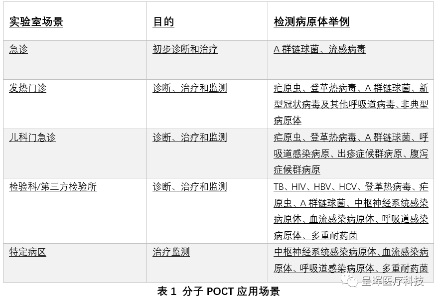 2021年7月发布的《病原体核酸即时检测质量管理要求专家共识》里面对于分子POCT的应用场景、检测标本类型、检测的病原体以及主要用途都有详细罗列。具体可以参见下面的两个表格: 从表1和表2我们也可以看到,其主要的应用场景、检测的病原体、标本类型以及检验目的与GeneXpert和FilmArray在欧美国家的使用情况并无太大区别。