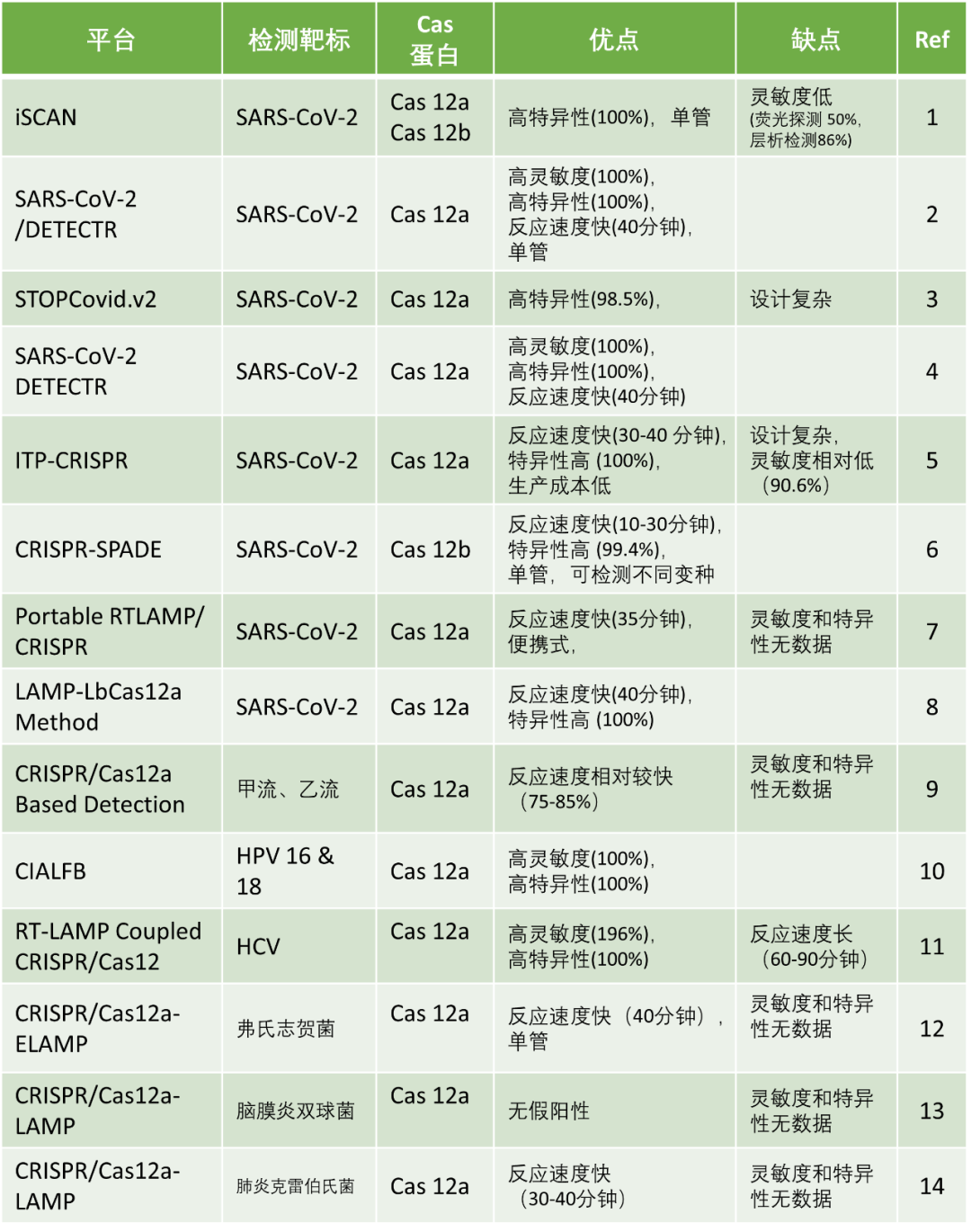 成功管理传染病和流行病的首要任务是快速准确地检测病原体,新冠就是一个最好的例子,并且POC检测的重要作用和需求也在疫情中凸显出来。 根据世卫组织给出了关于POC检测的ASSURED标准:价格合理(Affordability)、灵敏度(Sensitivity)、特异性(Specificity)、易操作(User-friendly)、快速可靠(Robust)、便携性(Equipment-free)及即时性(Deliverable)。 但是其实,要开发出符合所有这些标准的病原体特异性POC检测还是有难度的。因此,利用现有技术的结合一直是近些年体外诊断企业的重点努力方向。 其中最具有突破性并已有结果的一个技术就是结合了等温扩增的CRISPR技术,满足了ASSURED标准,是开发新一代POC诊断的理想方法。 本文将重点总结基于LAMP的CRISPR技术,围绕以下几个方面分享: 1)LAMP和CRISPR技术 2)为什么选择LAMP与CRISPR技术结合 3)LAMP-CRISPR技术在POC平台上应用 01 LAMP LAMP环介导等温扩增是在2000年由日本荣研化学株式会社纳富继宣博士发明的一种简单、快速、准确、便宜的新型基因扩增方法,随后被用于各种人体、动物和农业的病原体检测。尤其是在新冠疫情期间,随着许多改良的LAMP方法应用于检测SARS-CoV-2病毒,LAMP技术已进入了黄金时期。 该技术主要特点是用到4-6个识别目标DNA 特定区域的引物。扩增反应首先由具有链置换活性的Bst酶和两个特别设计的引物引发形成环状结构,引起随后几轮扩增后产生大量的DNA。通常来说,1 - 10个DNA拷贝可在15-60分钟内扩增获得 10^9 – 10^10 拷贝的DNA产物,是灵敏度和特异性都很高的扩增方法。 LAMP反应操作简便,不需要像qPCR一样经过不同温度循环,可以在60-65°C恒温下扩增,其反应结果可以通过浊度法、荧光法和探针法进行观察。 02 CRISPR CRISPR (Clustered Regularly Interspaced Short Palindromic Repeats,基于成簇间隔短回文重复序列 )作为一种基于RNA的后天免疫防御系统,其间隔序列与噬菌体或质粒序列存在同源性,能利用靶位点特异性的RNA指导Cas蛋白靶向几乎所有生物和细胞中遗传错误的基因。 CRISPR/Cas系统由靶向外源基因组材料特定区域的引导RNA序列(gRNA)和效应Cas(CRISPR相关核酸酶)蛋白组成。 CRISPR/Cas系统是一种非常独特且极具前景的技术,可用于基因编辑和分子诊断,能够通过编程gRNA序列靶向任何基因区域,其在传染病检测中最重要的作用是通过使用Cas蛋白识别病原体和基于核酸的诊断。 CRISPR/Cas技术在核酸检测中的使用需要前置扩增或后置扩增。通过将CRISPR/Cas技术与PCR或等温扩增,如LAMP、RPA、NASBA和RCA等方法相结合,开发了新一代的分子诊断方法,可以高灵敏度和特异性检测DNA和RNA。 03 LAMP-CRISPR 基于LAMP的CRISPR技术是近年来研发出用于病原体检测的新一代分子诊断技术,这种技术的结合应用消除它们单独使用时存在的限制。 比如说,LAMP虽然有快速扩增的优势,但是很容易出现假阳性的问题。不正确的引物设计、受污染的DNA和未优化的反应体系(如缓冲液pH值、Mg浓度、具有干扰作用的染料)可能导至检测的特异性和灵敏度降低。 而CRISPR/Cas技术使用reporter来检测特异性靶标,可以消除LAMP的局限性,降低假阳性结果的可能,实现高灵敏度和高特异的检测。 结合LAMP的CRISPR/Cas技术可以通过荧光层析纸条或直接肉眼判断检测结果,不需要像其他核酸检测一样进行定量测量,实现高效、灵敏、特异且不需要复杂设备的POC检测。 LAMP-CRISPR/Cas技术已被用于检测各种传染性病毒和细菌(表1)。在许多检测中,这种技术对病原体检测中显示出高达100%的特异性和灵敏度。与金标准qPCR相比,LAMP-CRISPR检测周转时间更短,非常适合用于快速检测。 表1 各种LAMP-CRISPR/Cas应用平台比较 尽管如此,LAMP-CRISPR/Cas也是具有一些局限性的,主要源于这项技术需要两个步骤,即扩增过程和CRISPR/Cas过程。这两个过程具有不同的化学成分和反应条件。LAMP扩增中使用的Bst酶反应温度在60-65度,而CRISPR反应的Cas酶在37度左右,整个反应需要两个不同的温度。使用两种不同的反应过程和反应体系可能会增加污染风险。 目前,也有解决办法可以克服这个局限性,比如说,在HOLMESv2检测中,通过使用嗜热Cas12b(从嗜酸芽孢杆菌中分离)实现单管反应,解决不同反应温度的问题。 也有的为了最大限度地降低对操作人员的技术需求和污染风险,通过在反应试管底部用油密封LAMP试剂,把CRISPR试剂反应管盖上来实现单管反应。LAMP扩增后,将试管倒置混合启动CRISPR/Cas12a过程。 CRISPR/Cas技术也可以与PCR和其他等温方法相结合,如NASBA、RCA和RPA,但是都具有一定局限性。 比如说由于需要用于热循环的复杂设备,PCR在POC诊断平台中不是优选的。 与LAMP类似,其他等温扩增方法也不需要复杂的设备,不过它们通常需要两个引物、两种或多种酶。例如,NASBA需要使用三种酶来扩增RNA或单链DNA,此外与其他方法相比,CRISPR和NASBA组合的灵敏度较低。相比之下,LAMP技术通过使用单一的Bst酶成本和操作复杂性更低。并且LAMP通过使用多个引物提供了更高的特异性和更高的效率。 RPA虽然用的也较多,不过RPA需要最后一步将扩增产物转化为RNA分子,因此,它经常与Cas13酶结合使用,它最主要的优势是RPA反应的温度跟CRISPR反应温度接近,但是最大局限性是和CRISPR扩增的产物浓度较低。它在靶标浓度低的时候灵敏度不如LAMP好。当使用CRISPR组合LAMP时,可以获得高浓度的扩增产物。因此,LAMP优于其他等温方法更被优于选择与CRISPR技术结合使用在POC诊