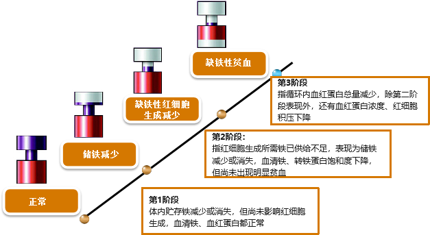 缺铁可分为三个阶段:储铁缺乏,缺铁性红细胞生成减少,缺铁性贫血(IDA)。