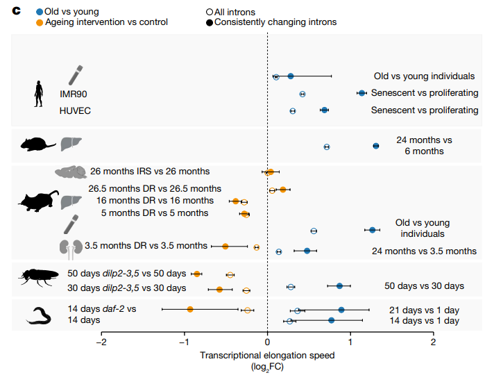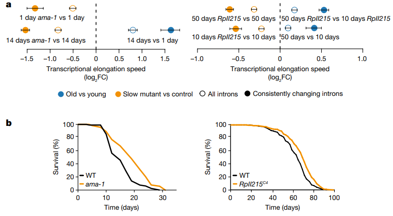 衰老,是一个复杂、多阶段、渐进的过程,发生在生命的整个过程。随着时间的流逝,人体的器官、肌肉会逐渐衰老,一些疾病也伴随着年龄的增长而发生,包括癌症、糖尿病、心血管疾病等。随着动物年龄的增长,细胞内的各种分子过程变得不再那么可靠,基因突变变得更加频繁,染色体末端变得更短。许多研究探讨了衰老对基因表达的影响,但目前尚不清楚衰老如何影响转录过程。2023年4月12日,德国科隆大学、马克斯普朗克衰老生物学研究所的研究人员在国际顶刊" Nature "上发表了一篇题为" Ageing-associated changes in transcriptional elongation influence longevity "的研究论文。该研究显示,随着年龄的增长,基因的转录速度增加,导至转录保真度丧失,从而基因产物的质量受到影响,更容易出错。然而,限制饮食和抑制胰岛素信号可以逆转大部分与衰老相关的变化,减缓基因的转录速度,动物模型中显示,可延长10-20%的寿命。在该研究中,研究人员描述和分析了5种不同生物体(线虫、果蝇、小鼠、大鼠和人类)多组织转录过程中与衰老相关的全基因组、年龄相关变化,测量了衰老如何改变驱动转录的酶-RNA聚合酶II(Pol II)在复制RNA时沿着DNA链移动的速度。RNA聚合酶(蓝色)解开DNA(紫色),将其作为模板产生信使RNA链(红色)。在衰老的细胞中,这一过程加速。图源:selvanegra/Getty研究发现,在5个物种中,随着年龄的增长,平均转录延伸速度都随着年龄的增长而增加,转录过程都变得不太精确且更容易出错,产物和参考DNA存在更多不匹配。随着这种延伸速度的加快,研究人员还观察到了剪接的变化,剪接是从基因到成品蛋白质的转录过程中的步骤。早期的研究显示,限制饮食和抑制胰岛素信号可以延缓许多动物的衰老并延长寿命,因此研究人员分析了这些措施是否对 Pol II 的速度产生影响。研究发现,通过限制饮食和抑制胰岛素信号,线虫、小鼠、大鼠和果蝇中,Pol II 的移动速度较慢。随后,研究人员又分析了 Pol II 速度的变化是否会影响寿命。研究人员跟踪了携带胰岛素信号基因突变果蝇和线虫的存活情况,发现寿命比非突变动物长10%-20%。当研究人员使用基因编辑来逆转蠕虫的突变时,发现动物的寿命又缩短了,这进一步证实了 Pol II 的移动速度与寿命之间的因果关系。不仅如此,早期的研究显示,核小体沿DNA定位会影响 Pol II 延伸速度和剪接,因此,与年龄相关的染色质结构变化可能会影响 Pol II 的移动速度。通过分析人类肺细胞和脐静脉细胞,研究人员发现衰老细胞含有较少的核小体,当提高细胞中组蛋白的表达时,Pol II 的移动速度较慢。在果蝇中,升高的组蛋白水平似乎延长了它们的寿命。研究人员表示,这是一项非常令人兴奋的发现,证明了远亲物种的衰老机制是一致的,这也为探索 Pol II 如何成为减缓衰老过程的药物的靶点打开了大门。总之,研究结果揭示了动物衰老的基本分子机制和延长寿命的干预措施,为我们未来如何促进健康衰老提供了线索,例如限制饮食,通过提高基因转录质量,在分子水平上对健康的衰老过程产生积极影响。https://doi.org/10.1038/s41586-023-05922-yhttps://www.nature.com/articles/d41586-023-01040-x |