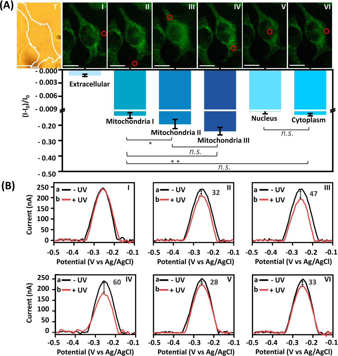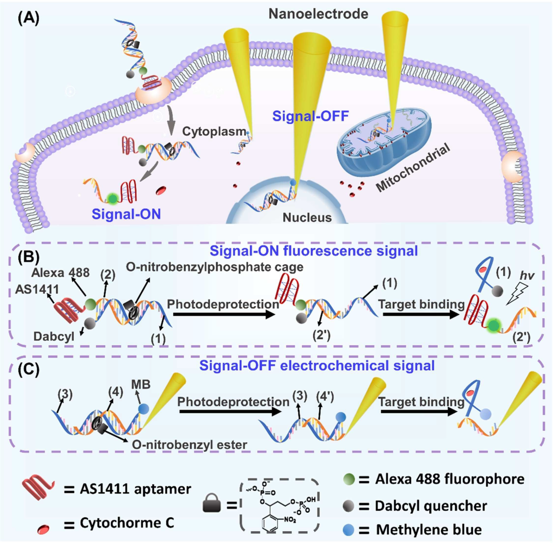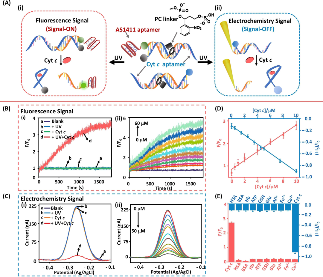 细胞色素c(Cyt.c)是半胱天冬酶(caspases)激活细胞凋亡的关键启动剂。细胞结构区室中Cyt.c含量的时空评价以及细胞凋亡期间细胞结构区室之间Cyt.c传递的检测,对于分析细胞活力非常重要。本研究设计了用于单细胞水平Cyt.c定量评估的光学探针和电化学探针。该光学/电化学探针用光响应的邻硝基苄基磷酸酯-笼状Cyt.C适配体结构进行功能化。在光刺激条件下,笼状结构将在单细胞结构区室内打开,从而允许在非凋亡或凋亡条件下通过形成Cyt.c/适配体复合物来时空检测Cyt.c。该探针可用于在凋亡/非凋亡条件下区分上皮MCF-10A乳腺细胞、恶性MCF-7和MDA-MB-231乳腺细胞的细胞区室中Cyt.c的含量。 图1. 单个活细胞中Cyt.c的时空检测。 A)监测亚细胞区室中Cyt.c的示意图。 B)Cyt.c的光学信号打开(Signal-ON)的荧光检测原理。 C)通过氧化还原活性核酸框架修饰的纳米电极对Cyt.c进行信号关闭(Signal-OFF)电化学检测的原理。 结构设计上,光学探针包括一个光响应的磷酸硝基苯酯桥联双链框架,该框架由笼状抗Cyt.c适配体序列组成,并用一对荧光标记和一个与AS1411适配体偶联的猝灭剂进行修饰,作为细胞渗透载体。电化学探针由修饰有光响应邻硝基苄基磷酸酯桥接核酸双链体的纳米电极组成,该双链体由亚甲蓝(MB+)氧化还原标记功能化的笼状Cyt.c适配体链组成。其中,实时单细胞多模态分析仪为电化学探针的亚细胞结构定位和检测提供了有力工具。 图2. 通过光学或电化学纳米探针的荧光和电化学检测Cyt.c。 A) 溶液中Cyt.c的检测示意图:(i)荧光光学纳米探针(ii)电化学氧化还原修饰的纳米电极。B)(i)实时监测光活化荧光探针的荧光变化(ii)在分析不同浓度的Cyt.c时实时监测光活化荧光探针的荧光变化。C) (i)对应于光活化的电化学探针的伏安曲线(ii)对应于不同浓度Cyt.c下光活化电化学探针的电流变化的伏安曲线。D)Cyt.c检测的校准曲线。E)通过光学或电化学探针对Cyt.c分析的选择性评估。 检测原理上,合成的光学探针会渗透到细胞中,探针的时空光化学解封,随后分离,同时形成荧光Cyt.c适配体复合物,产生荧光信号。而电化学探针则在限定的单细胞区室(线粒体、细胞质、细胞核)中的空间定位之后,通过感测模块的光激活,导至氧化还原标记的MB+-Cyt.C适配体/Cyt.c复合物的分离。随后,伴随的时空伏安变化允许在单细胞水平上对细胞亚结构中的Cyt.c进行时空定量分析。 图3. 单个Hela细胞不同区室中Cyt.c浓度的电化学评估。A)明场细胞图像和Calcein AM染色的单细胞,红圈表示Cyt.c纳米电极的定位。B)对应于电化学纳米电极探针在目标分析位点的响应伏安图(用红圈标记),其中黑色曲线未进行UV活化,红色曲线进行了UV活化。 图4. A)剂量控制CaCl2处理诱导Hela细胞凋亡,用于Cyt.c检测的光学探针的UV光激活检测示意图。B)CaCl2诱导的细胞凋亡的Hela细胞共聚焦显微镜图像。 图5. 在不同浓度的CaCl2存在下,在不同时间间隔刺激细胞凋亡时Hela细胞细胞质中Cyt.c浓度的电化学探测。 实验结论上,该光学和电化学检测单个Hela癌症细胞亚结构中Cyt.c,并证明了细胞凋亡时Cyt.c从线粒体向细胞质的动态移位。此外,定量分析和比较了非凋亡或凋亡条件下恶性乳腺细胞(MCF-7;MB-MDA-231)和上皮性乳腺细胞(MCA-10A)中Cyt.c的水平,并证明了凋亡时的显著浓度差异和易位效率。 图6. A)未凋亡MCF-7、MDA-MB-231和MCF10A细胞经光学荧光探针显示后的共焦显微镜图像。B)同种细胞在250mM CaCl2处理下诱导凋亡。C)、D)、E)三种细胞不同结构区室内(胞质、线粒体、胞核)Cyt.的电化学探测。 总之 本研究引入了基于适配体的光响应光学和电化学探针,用于单细胞水平上Cyt.c的时空检测。邻硝基苄基磷酸酯保护的纳米探针的光诱导解封,使光学或电化学探针能够被指令触发、空间靶向地激活,用于在单细胞水平上Cyt.c检测和成像。包括定量评估由线粒体、细胞质和细胞核组成的单细胞区室、活细胞和凋亡细胞中的Cyt.c。该研究提供了在单细胞水平上扩展亚细胞区室上其他生物标志物时空检测的实验工具。 来源:珀金埃尔默生命科学 --------------------------------------- End |