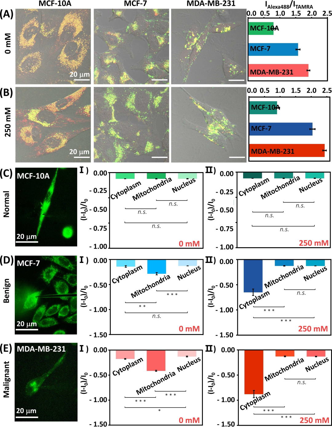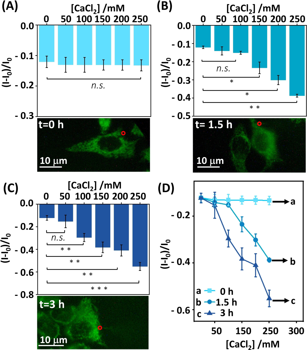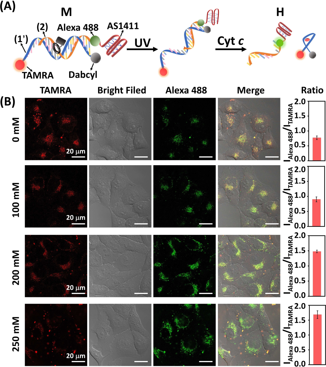 细胞色素c(Cyt.c)是半胱天冬酶(caspases)激活细胞凋亡的关键启动剂。细胞结构区室中Cyt.c含量的时空评价以及细胞凋亡期间细胞结构区室之间Cyt.c传递的检测,对于分析细胞活力非常重要。本研究设计了用于单细胞水平Cyt.c定量评估的光学探针和电化学探针。该光学/电化学探针用光响应的邻硝基苄基磷酸酯-笼状Cyt.C适配体结构进行功能化。在光刺激条件下,笼状结构将在单细胞结构区室内打开,从而允许在非凋亡或凋亡条件下通过形成Cyt.c/适配体复合物来时空检测Cyt.c。该探针可用于在凋亡/非凋亡条件下区分上皮MCF-10A乳腺细胞、恶性MCF-7和MDA-MB-231乳腺细胞的细胞区室中Cyt.c的含量。 图1. 单个活细胞中Cyt.c的时空检测。 A)监测亚细胞区室中Cyt.c的示意图。 B)Cyt.c的光学信号打开(Signal-ON)的荧光检测原理。 C)通过氧化还原活性核酸框架修饰的纳米电极对Cyt.c进行信号关闭(Signal-OFF)电化学检测的原理。 结构设计上,光学探针包括一个光响应的磷酸硝基苯酯桥联双链框架,该框架由笼状抗Cyt.c适配体序列组成,并用一对荧光标记和一个与AS1411适配体偶联的猝灭剂进行修饰,作为细胞渗透载体。电化学探针由修饰有光响应邻硝基苄基磷酸酯桥接核酸双链体的纳米电极组成,该双链体由亚甲蓝(MB+)氧化还原标记功能化的笼状Cyt.c适配体链组成。其中,实时单细胞多模态分析仪为电化学探针的亚细胞结构定位和检测提供了有力工具。 图2. 通过光学或电化学纳米探针的荧光和电化学检测Cyt.c。 A) 溶液中Cyt.c的检测示意图:(i)荧光光学纳米探针(ii)电化学氧化还原修饰的纳米电极。B)(i)实时监测光活化荧光探针的荧光变化(ii)在分析不同浓度的Cyt.c时实时监测光活化荧光探针的荧光变化。C) (i)对应于光活化的电化学探针的伏安曲线(ii)对应于不同浓度Cyt.c下光活化电化学探针的电流变化的伏安曲线。D)Cyt.c检测的校准曲线。E)通过光学或电化学探针对Cyt.c分析的选择性评估。 检测原理上,合成的光学探针会渗透到细胞中,探针的时空光化学解封,随后分离,同时形成荧光Cyt.c适配体复合物,产生荧光信号。而电化学探针则在限定的单细胞区室(线粒体、细胞质、细胞核)中的空间定位之后,通过感测模块的光激活,导至氧化还原标记的MB+-Cyt.C适配体/Cyt.c复合物的分离。随后,伴随的时空伏安变化允许在单细胞水平上对细胞亚结构中的Cyt.c进行时空定量分析。 图3. 单个Hela细胞不同区室中Cyt.c浓度的电化学评估。A)明场细胞图像和Calcein AM染色的单细胞,红圈表示Cyt.c纳米电极的定位。B)对应于电化学纳米电极探针在目标分析位点的响应伏安图(用红圈标记),其中黑色曲线未进行UV活化,红色曲线进行了UV活化。 图4. A)剂量控制CaCl2处理诱导Hela细胞凋亡,用于Cyt.c检测的光学探针的UV光激活检测示意图。B)CaCl2诱导的细胞凋亡的Hela细胞共聚焦显微镜图像。 图5. 在不同浓度的CaCl2存在下,在不同时间间隔刺激细胞凋亡时Hela细胞细胞质中Cyt.c浓度的电化学探测。 实验结论上,该光学和电化学检测单个Hela癌症细胞亚结构中Cyt.c,并证明了细胞凋亡时Cyt.c从线粒体向细胞质的动态移位。此外,定量分析和比较了非凋亡或凋亡条件下恶性乳腺细胞(MCF-7;MB-MDA-231)和上皮性乳腺细胞(MCA-10A)中Cyt.c的水平,并证明了凋亡时的显著浓度差异和易位效率。 图6. A)未凋亡MCF-7、MDA-MB-231和MCF10A细胞经光学荧光探针显示后的共焦显微镜图像。B)同种细胞在250mM CaCl2处理下诱导凋亡。C)、D)、E)三种细胞不同结构区室内(胞质、线粒体、胞核)Cyt.的电化学探测。 总之 本研究引入了基于适配体的光响应光学和电化学探针,用于单细胞水平上Cyt.c的时空检测。邻硝基苄基磷酸酯保护的纳米探针的光诱导解封,使光学或电化学探针能够被指令触发、空间靶向地激活,用于在单细胞水平上Cyt.c检测和成像。包括定量评估由线粒体、细胞质和细胞核组成的单细胞区室、活细胞和凋亡细胞中的Cyt.c。该研究提供了在单细胞水平上扩展亚细胞区室上其他生物标志物时空检测的实验工具。 来源:珀金埃尔默生命科学 --------------------------------------- End |