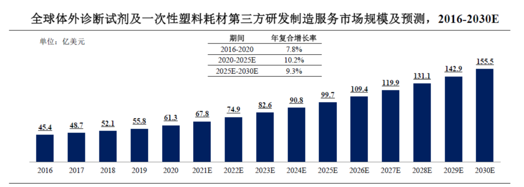 一、IVD仪器CDMO行业的基本概况 体外诊断,即IVD(In Vitro Diagnosis),是指在人体之外,通过使用耗材、仪器等对人体样本(血液、体液、组织等)进行检测与校验,而获取临床诊断信息,进而对疾病进行预防、诊断、治疗检测、后期观察、健康评价及遗传疾病检测的过程。根据检测原理或应用场景,体外诊断市场一般可分为以下几个细分领域:临床检验、生化诊断、免疫诊断、分子诊断、微生物诊断和即时诊断(POCT)。体外诊断可用于诊断、监视、筛查和评估疾病的易感性,从而有助于获得有关患者的可用医学信息。通过更早和更有针对性的诊断,体外诊断有助于减少患者的住院时间和康复所需的时间。根据体外诊断提供的信息做出医疗决定,有助于指导临床做出更有效率或更加准确的干预和治疗。典型的体外诊断过程需由诊断设备(仪器)使用配套的诊断耗材来产生测试结果。由于每种型号体外诊断分析仪都有专门的诊断目的,需要某些特定的耗材才能执行相关的体外诊断过程,因此耗材也将为体外诊断公司提供了经常性收入来源。体外诊断行业相关的产品主要由仪器、试剂及一次性塑料耗材等部分构成。其中,体外诊断仪器是通过对检测耗材与人体内物质发生生物化学反应时所产生的化合物或化学反应进行定量、定性的分析而得到检测结论的仪器,它对疾病的预防、诊断、监测疾病以及遗传性疾病的预测具有重要作用。体外诊断在样本采集、核酸提取和聚合酶链反应(PCR)三大过程中,除了诊断仪器外,还需要大量的一次性塑料生物实验耗材,如PCR 管、酶标板、反应杯、移液枪头、深孔板等,作为体外诊断全服务流程中必不可少的一部分,这类耗材也可为体外诊断企业提供稳定的现金流。体外诊断仪器、试剂及一次性塑料耗材第三方研发制造服务(仪器领域的“第三方研发制造服务”以下又称为“CDMO 服务”)是指主要通过合同形式向体外诊断仪器及耗材企业提供工艺研发设计、生产服务的第三方专业服务机构。它旨在帮助医疗器械研发主体提高质量管控、缩短试产周期、降低生产成本和提高生产效率。国内的第三方研发制造服务机构较多,但是能从研发一直贯穿到生产的公司很少,主要集中在小规模试产和上市后生产环节。体外诊断仪器、试剂及一次性塑料耗材研发外包服务涵盖临床前研究、小规模试产、临床试验、注册申报和上市后生产5 个环节。根据不同环节提供针对性的服务,主要包括市场调研、风险管理、产品定型、厂房设计建设、工艺流程优化、临床试验方案设计、申报资料编写、规模化委托生产等。体外诊断仪器、试剂及一次性塑料耗材的第三方研发制造在这五个环节中连接紧密,相互支撑,但也存在差别。前者的价值更多的在于研发能力,是技术密集型的外包服务;后者的价值更多体现的是高超的工艺技能与较大的资产规模,是技术密集型和资本密集型的结合,具有更高的准入门槛。体外诊断行业技术更新较快,不论是诊断试剂还是仪器,不同产品均存在一定的技术壁垒,无法相互兼容。体外诊断仪器从研发到上市亦是一项高技术、高风险、高投入和长周期的复杂系统工程,行业中只有少数企业可以兼顾试剂和仪器都达到较高的技术水平,即便国际体外诊断巨头罗氏、雅培、贝克曼、西门子等,为了集中资源优势,多数诊断仪器产品也选择与第三方合作,委托第三方进行诊断仪器的研发和制造。由此可见,专业的CDMO 服务商在诊断仪器研发、制造、上市的整个生命周期中扮演着重要角色。在国内,由于产业发展时间较短以及技术水平的限制,从事体外诊断产业的企业主要为试剂厂商,诊断仪器自主研发和生产厂商较少,早期多依赖于进口仪器。随着国内诊断仪器研发和生产能力的提升,国内大型试剂厂商开始自主研发和生产配套仪器,但由于大部分中小型试剂厂商一方面不具备独立开发配套诊断仪器的技术能力,另一方面企业资金有限,难以打造和培养一支专业的研发团队,难以建设独立的生产线,其对诊断仪器CDMO服务需求更加迫切,诊断仪器CDMO模式由此诞生。注册人制度出台前,医疗器械注册证必须由医疗器械生产企业持有,需要投入巨大的资金进行工厂建设和生产检验设备采购,同时要求企业具备较强的生产管理能力及质量体系监管能力,持有医疗器械注册证的准入门槛很高。注册人制度出台后,医疗器械注册证持有者可以通过委托生产质量管理体系健全的医疗器械生产企业进行研发生产,从而为CDMO 模式在国内大力推行奠定了制度基础。医疗器械注册人制度下,注册人既可以自行生产,也可以委托单个或多个企业生产。在委托生产中,原本有资质的受托方即第三方研发制造服务商可直接进行生产,也可凭借注册人的委托书申请生产许可证生产。在更灵活的委托机制下,受托方不需要具备医疗器械注册证也可从事生产,从而真正实现注册证与生产许可证的分离。该制度有利于激发医疗器械企业创新的积极性,有利于医疗器械第三方研发制造服务商的发展。随着政策的持续引导,医疗器械行业主体责任将得到进一步强化,产业分工及竞争格局会更加明晰,医疗资源配置和利用率也将极大地优化,从而推动医疗器械产业朝着更有活力、更适应国家发展战略的方向进步。同时,该制度的全面推广实施也将极大促进新的体外诊断商业模式出现、打造