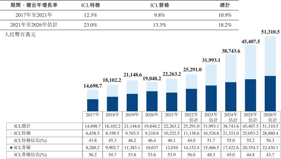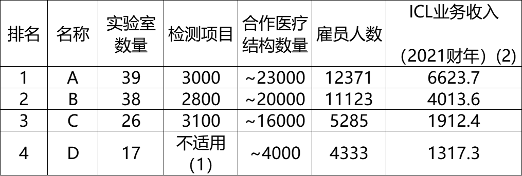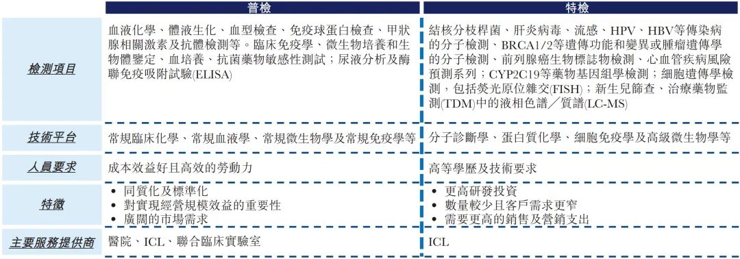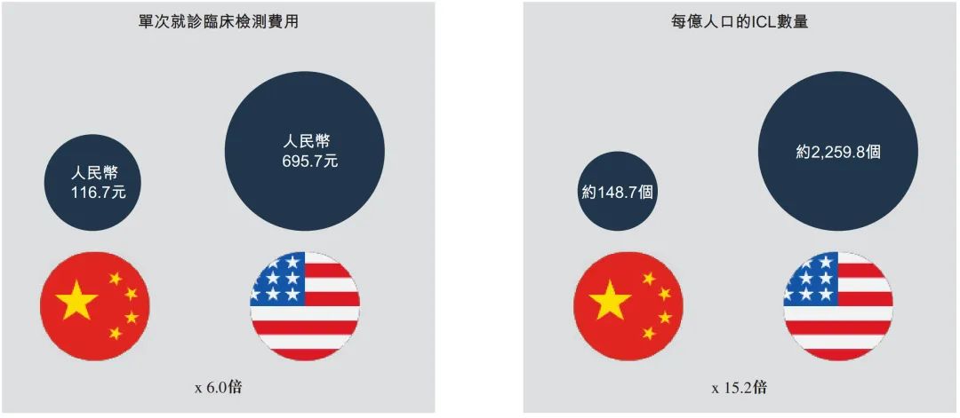 1.1 临床诊断检测简介 临床诊断检测是在实验室进行的医疗检测,旨在提供有关某一人士健康状况的资料。这一资料可协助医生针对病患护理作出精确及个人化的诊断决策。 根据弗若斯特沙利文的资料,大约70%至80%的临床决策乃以某些形式的实验室检测为基础。此外,临床检测亦能够协助制药及生物技术公司研发新药及疫苗,支持私营企业雇主检测其雇员的酒精及药物滥用情况,并帮助保险公司评估与申请人健康状况有关的风险。 临床诊断检测通常由三类提供商进行,即医院实验室、独立医学实验室或ICL及其他(如医生办公室、疗养院及门诊手术中心),其中,就收益及检测量计,医院实验室为最大的医学检验服务提供商。 医院实验室通常仅为其自身住院病人提供检测,而另一方面,ICL独立于医院,自大量医院及研究机构接收样本进行分析。相较于医院实验室,ICL的规模通常较大。ICL通常拥有更先进的设备及技术上更训练有素的实验室人员,使得彼等能够以更具成本效益的方式进行专业检测及大量测试。 根据弗若斯特沙利文的资料,医院实验室的测试目录通常拥有约800项测试项目,大部分为普检项目,可满足一家医院就诊患者的基本诊断需求,而ICL通常能够提供检测1,000多项测试项目,包括涵盖专业特检在内的各种检测类型。 下图概述中国临床检验服务提供商的优势及劣势。 ICL是经卫生行政部门许可,具有从事临床或病理试验服务资格的独立法人实体。 中国ICL产业的发展可分为五个阶段:起步阶段(1980年代至1994年)、探索阶段 (1994年至2004年)、初步发展阶段(2004年至2016年)、快速发展阶段(2016年至2019 年)及加速发展阶段(2019年至今) 1980年代以前,中国的医疗诊断服务均由医疗机构的临床实验室及病理科提供。 随着诊断技术的发展及临床需求的变化,中小型医院由于能力有限而无法进行全面的检测,从而导至需要将患者的样本转移至大型医院进行诊断。 1980 年代中期,扬州临床检验中心开始提供体检服务。 后来,随着医疗服务市场的不断开放,一些检验服务中心开始与医院合作,形成单体ICL,仅提供有限的检测,并未规模效益。 1994年,中国第一家ICL成立,附属于一所医学院。自1994年至2004年,中国ICL产业开始缓慢发展。 2004 年,卫生部在中国举办了第一届ICL 研讨会,汇集了中国各地的医学专家、医疗器械及试剂供货商。此后,国内一大批ICL 及连锁机构相继成立。 2009年,卫生部颁布《医学检验所基本标准(试行)》,正式承认ICL的合法地位,此后该行业经历了显著增长。自2014年以来,ICL行业进入创新发展的新阶段,中国的ICL规模开始迅速扩大。 2015 年9 月8 日,国务院办公厅颁布《关于推进分级诊疗制度建设的指导意见》,指导各地就提供诊断及医疗服务推进分级诊疗制度建设。随着该等政策的实施,ICL市场持续增长。 快速发展阶段(2016年至2019年) 2016 年,国家卫生健康委员会颁布《医学检验实验室基本标准和管理规范(试行)》,鼓励发展连锁ICL及应用检验新技术,推动特检市场扩张。 2018 年,国家卫生健康委员会出台公立医院医学检验服务可外包予第三方医疗机构的政策,推动ICL市场的进一步增长。 加速发展阶段(2019年至今) 为应对2019 年底暴发的COVID-19疫情,政府出台了多项关于规范ICL管理及质量控制系统的规定,以提高其准确性及一致性。 2021年3月,国务院颁布《医疗器械监督管理条例》,规定对于国内尚无同品种产品上市的体外诊断试剂,符合条件的医疗机构可以根据其自身实验室的临床需要自行研制,并在合资格医务人员的指导下于其自身的实验室内使用。此条例可被视为对临床实验室自建项目(或LDT)的有利政策。由于需求增加及政策利好,中国ICL的数量自2009年的不足70个增加至2021年的2,100多个。 第二章 中国ICL市场的规模及增长动力 2.1 中国ICL市场的主要增长动力 中国ICL市场的增长受到并将继续受到以下关键因素的推动: 中国人口快速老龄化,于2017 年至2021 年65 岁以上的人口数量以6.1%的复合年增长率增长,预计于2021年至2025年将以5.4%的复合年增长率进一步增长,并于2025年底达到247.1 百万。中国严重的老龄化问题已直接导至慢性病患病率激增及重病患者数量增加,这两者已经并将继续推动检测需求,从而提高检测量。 此外,健康意识的增强及慢性病病例的激增促使人们尽早发现并采取主动预防措施。中国体检行业以4.3%的复合年增长率增长,由2017年的人民币1,183亿元增长至2021年的人民币1,400亿元,预计于2026年达到人民币1,784亿元。中国体检人数于2021年达到447.4百万,预计将以4.4%的复合年增长率增长至2026年的521.1百万。受不断增长的客户需求的推动,健康体检中心的外包检测率不断提高,因为其受到激励寻求以优质质量进行的具有成本竞争力的检测。 此外,精准医疗领域的不断发展及新技术的出现亦极大地刺激中国ICL 市场的发展。精准医疗是一种医学模型,提出针对患者亚组的医疗决策、治疗、试验或产品的个人化,而非一刀切的模型。精准医疗有望将药物及治疗重点从反应转向预防,提高疾病检测能力并预防疾病发展,从而推动对更精准及更优质的医疗服务的需求。 2015 年,科技部首次召开「国家精准医疗战略专家会议」,代表中国在战略层面进入「精准医疗」时代。 ICL于精准医疗时代变得越来越重要。 其将在很大程度上帮助医生整合来自临床因素、实时监