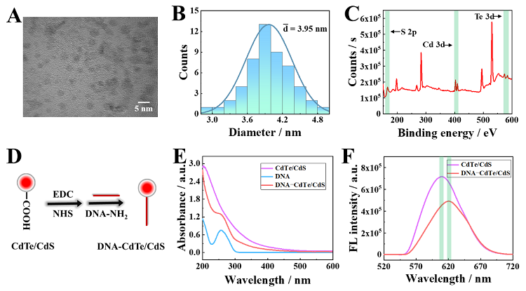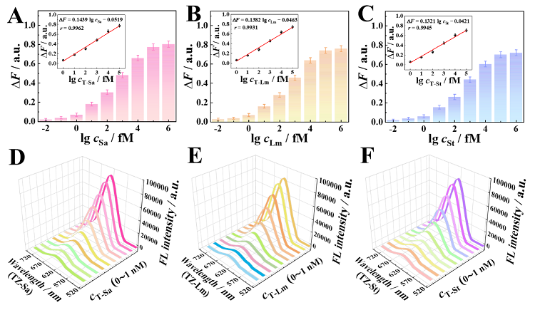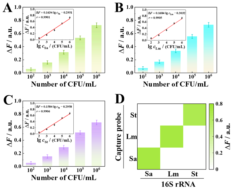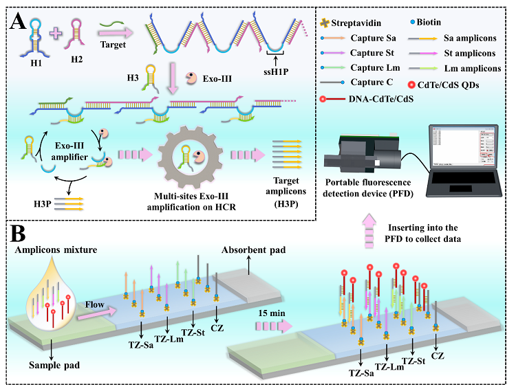 致病菌对人类健康构成严重威胁,及时、灵敏地检测病原体对于确诊感染源、预防疾病传播和改善患者治疗至关重要。研究表明细菌16S rRNA包含种间差异信息,典型的细菌拥有约10000个16S rRNA拷贝;将16S rRNA作为检测模板对于低浓度病原体的即时检测(POCT)具有重大意义。 侧流层析技术(LFA)一种集分离与检测为一体的通用工具,但常规的二元“是/否”定性读数限制了其应用。目前,基于智能手机的读取器在比色或荧光LFA中很受欢迎;通过手机相机拍取荧光图片,再由图像处理软件(如Image J)转换为绝对值;在拍照进行定量分析时,照明条件、光学设置和焦距在内的各种因素都会给最终结果带来干扰。因此,构建一种直接定量检测LFA信号、没有复杂的操作规则和数据转换的便携式检测设备能够积极推动LFA在病原体核酸POCT中的应用。近日,哈尔滨工业大学(深圳)李迎春教授团队提出了一种杂交链式反应介导的多位点核酸外切酶III的一锅法、超灵敏等温扩增技术(HCR/Exo-III扩增)和便携式荧光阵列试纸条定量检测设备(PFD-LFA)用于多种细菌16S rRNA的POCT。在该工作中,他们设计了多功能的双茎环DNA发夹探针(H1),其上环茎锁定启动Exo III扩增的特异性引物(H1P),而下环茎用于HCR扩增;当目标物引发HCR反应后会将H1发夹之前锁定的H1P释放出来形成ssH1P;ssH1P进一步与H3杂交形成H3 3'-钝端以提供多个Exo III作用位点;其中Exo III触发H3的消化以释放ssH1P和残余的H3产物(H3P)。释放的ssH1P将参与H3识别和消化的下一个周期,而H3P作为最终扩增产物将在LFA中发挥桥梁作用。作为概念验证,选择了来自金黄色葡萄球菌(Sa)、单核细胞增生李斯特菌(Lm)和鼠伤寒沙门氏菌(St)的16S rRNA作为检测模型。当目标物的扩增产物(Sa amplicon、Lm amplicon和St amplicon)与DNA-CdTe/CdS荧光探针混合并在试纸条上层析15分钟后,将试纸条插入便携式荧光检测设备,便可直接读取每个细菌在测试区(TZ-Sa、TZ-Lm和TZ-St)的荧光信号。最终,该传感平台不仅实现了对合成的16S rRNA标准片段(T-Sa、T-Lm和T-St)的灵敏检测,而且对从真实细菌中提取出的天然16S rRNA也表现出优异的检测性能。 图1.(A)基于HCR/Exo-III信号放大的one-pot核酸扩增原理图。(B)荧光侧流层析反应示意图和便携式荧光设备用于检测多种细菌16S rRNA的流程图。 图2.(A)CdTe/CdS量子点的TEM表征,(B)CdTe/CdS量子点的粒径分析,(C)CdTe/CdS量子点的XPS表征,(D)DNA和CdTe/CdS QDs交联反应示意图,(E)CdTe/CdS、DNA-NH2和DNA-CdTe/CdS复合探针的Uv-vis表征,(F)CdTe/CdS QDs和DNA-CdTe/CdS复合探针的荧光光谱表征。 图3.(A)T-Sa、(B)T-Lm和(C)T-St的不同浓度(10-2、10-1、1、10、102、103、104、105、106 fM)与微型荧光计检测到的荧光响应之间的相关性。日立F-4600荧光计测定的(D)T-Sa、(E)T-Lm和(F)T-St的相应荧光发射光谱。 图4. 基于HCR/Exo-III扩增的便携式荧光定量试纸条分析设备用于定量检测(A)金黄色葡萄球菌Sa,(B)单增李斯特菌Lm和(C)鼠伤寒沙门氏菌St的16S rRNA,线性区间 (102 ~106 CFU/mL)。(D)三种细菌16S rRNA的正交检测结果。相关成果近期发表在Analytical Chemistry 期刊上,哈尔滨工业大学(深圳)的博士研究生彭锌为第一作者,通讯作者为哈尔滨工业大学(深圳)的李迎春教授和刘江博士。Ultrasensitive Hybridization Chain Reaction-Assisted Multisite Exonuclease III Amplification Strategy Combined with a Direct Quantitative Fluorescence Lateral Flow Technique for Multiple Bacterial 16S rRNA DetectionXin Peng, Xuecui Mei, Jiao Yang, Jiang Liu*, and Yingchun Li*Anal. Chem., 2023, 95, 5807–5814, DOI: 10.1021/acs.analchem.3c00270李迎春:哈尔滨工业大学(深圳)教授,入选国家高层次人才青年计划(2012),曾担任全国青联委员(2015)、中国青科协理事(2015)、江苏省“双创人才”(2015)。主要从事功能性高分子和传感器的研发,设计并制作了满足不同使用情景的系列传感器检测器件和设备,应用的领域包括疾病诊断、临床药物监测、食品安全、环境监测等。主持国家级、省部级各类课题20余项,其中国家自然科学基金5项。以第一/通讯作者发表SCI收录论文近百篇,EIS高被引5篇,亮点文章4篇。以第一完成人身份授权国家专利7项,与企业合作并实现成果转化3项,在三年期间创造经济效益超过1500万元。https://www.x-mol.com/university/faculty/50154刘江:哈尔滨工业大学(深圳)博士后,主要从事创新传感方法及微型传感器件的研发及其在药物分析、医学诊断中的应用。曾荣获省级优秀学位论文、3次荣获研究生国家奖学金、哈尔滨工业大学(深圳)优秀博士后等荣誉,以第一作者在Adv. Funct. Mater., Nano Research, Anal. Chem., Biosens. Bioelectron.等国际刊物上发表SCI收录论文十余篇(ESI高被引论文1篇,IF>5的论文10篇)。已申请国家发明专利6项(3项已授权),主持国家自然科学基金青年基金1项、中国博士后科学基金1项、广东省区域联合-青年基金1项,参与4项国家自然科学基金及多项省市级项目的立项申报与研究。曾参与项目获得2017年新疆生产建设兵团科技进步一等奖;研究成果在第25届全国发明展览会上获得“发明创业奖项目奖”银奖。