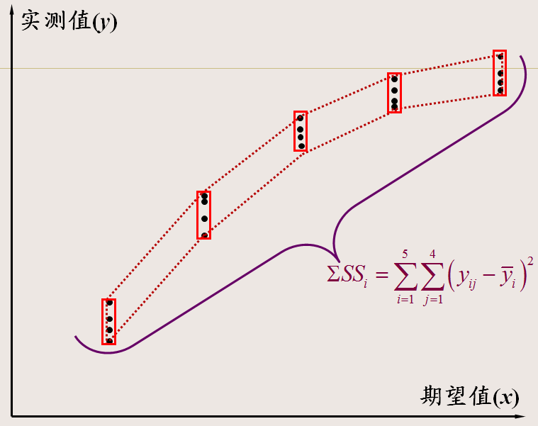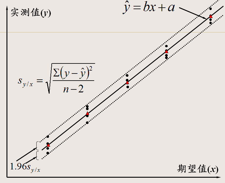 介绍CLSI EP6-P文件/ 定量检验线性性能评价 冯 仁 丰 病人结果检测范围,也即方法或检测系统的线性范围。 评价实验要求 1、进行检测范围实验的样品必须和真实样品尽可能相似,也即要和真实样品具相同的基质状态。 2、最好有5个或以上的系列浓度的实验样品,浓度范围遍布整个检测范围。最高浓度的样品应达到检测范围的上限。各实验样品内含分析物浓度间呈等比例关系,不要呈倍比关系。 3、加入的“浓储存液”体积不超过十分之一。 5L、4L+1H、3L+2H、2L+3H、1L+4H、5H 4. 每个样品至少作4次重复测定。 统计处理 1、若有5个浓度,每个浓度进行4次测定,则将所有20对(x,y)结果点于坐标纸上,观察有无线性表现。有线性的进行直线回归处理。 2、不取均值,直接对20对结果作回归处理。 3、直线回归式: 预期值为x,实测值为y。 为回归线上在对应x下的y值。 理想状态:b=1,a=0; 问题:绘制的回归线是作直线回归处理,所以画出来的线是直线。但是,实验结果是否能被确认,各个浓度间确实具有良好的线性关系,这才是最真实的。EP6-P就是用于判断线性的文件。 图1:线性评价中的直线回归 EP6-P文件基本原理 一、统计上评价线性的意义 EP6-P对线性数据处理的依据:线性数据的直线回归表现。 图2:线性评价中回归直线的意义 图3:线性评价的各组数据重复检测值的方差 进行回归处理的前提: 对实验数据的可靠性进行核查。 第一,各实验样品的重复数据中有无离群点; 第二,各实验样品重复数据组间的方差大小是否比较一致,即:是否某组的方差较其他组的方差大得多;若是这样,那么非线性不一定是真实的,是实验操作不精密度差所致。只有这两方面都符合要求,才可进行线性的统计检验。 图4:EP6-P线性评价5组样品重复检测结果的方差表现。 线性实验的总方差 线性实验的总方差反映了实验的总不精密度: 注:按照EP6-P线性评价实验方案,共有5个样品(i=5);每个样品进行了4次重复检测,j=4。 图5:线性评价实验数据点的方差 图6:线性评价实验数据点方差与回归直线的关系。 检测范围表现为直线时,各组数据实验具有的总方差(不精密度)为: 这些数据直线回归处理,所有实验点对于线的离散方差为: 由图说明,回归配合后引入的误差估计量,基本上就是由各组点的不精密度量总和ΣSS组成。 在EP6-P线性评价中,令这二者的差为“线性失拟误差(Lack of Fit,LOF)”。 求方差: (注:式中TE即ΣSS) 当实验结果呈线性表现时,LOF很小,它与自由度相除后,与ΣSS被自由度相除后的比值(F)将小于F0.05;由此,EP6-P文件判断实验结果为线性。 EP6-P对非线性数据处理的依据 非线性数据的直线回归表现: 图7:线性评价非线性的表现 图8:线性评价非线性的分析 非线性时的表现 上图说明:实验中各组数据的总不精密度依然与前线性表现时一致。 但是,非线性表现的各组数据点,仍然作直线回归处理时,为了顾及所有点的回归线,大大增加了所有各组数据点对于线的离散程度。 求方差: 当实验结果呈非线性表现时,LOF很大,它与ΣSS比值(F)将大于F0.05或F0.01;由此,EP6-P文件判断实验结果为非线性。 扫描二维码 获取配套视频 转载请注明出处 微信公众号:冯仁丰 |