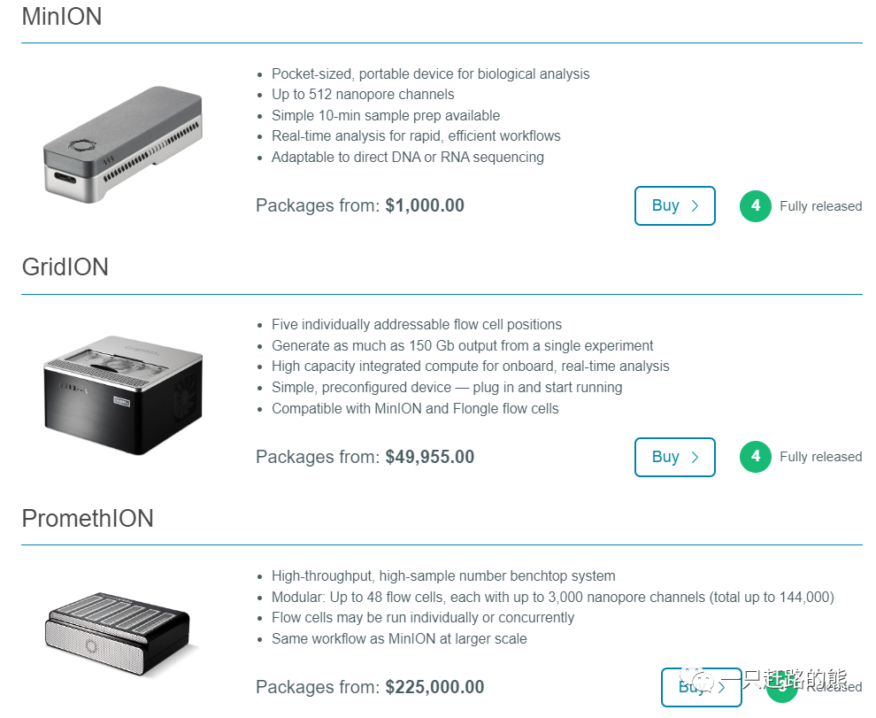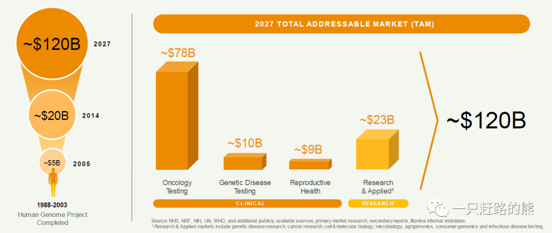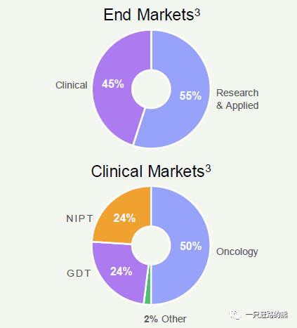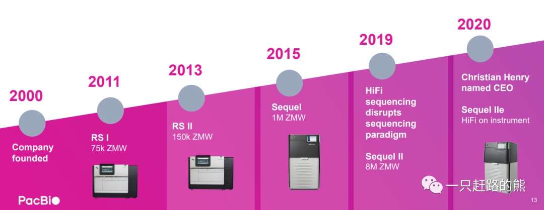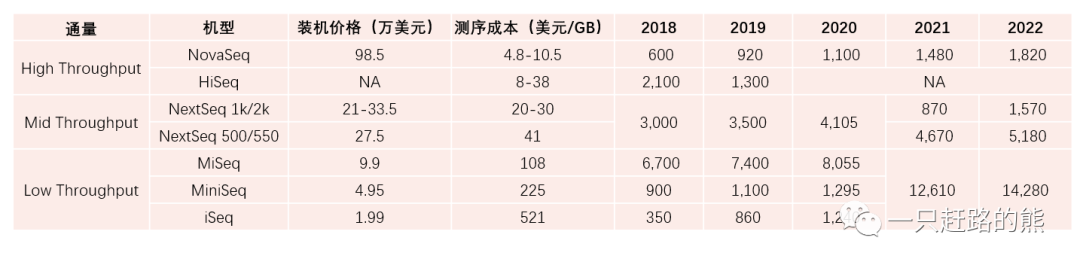 Chapter One 开宗明义 /// 长读长测序及其原理 测序技术发展多代,本质是对四种碱基通过不同类型的信号进行检测。一代测序Sanger法读取的是荧光信号;二代NGS测序中,illumina平台读取的是荧光信号,Ion Torrent测量的是pH值的变化。三代长读长测序的典型平台包括了Pacbio和ONT,Pacbio仍是读取荧光信号,而ONT则是通过电信号判断碱基类型。 长读长测序,顾名思义对应二代NGS技术的短读长测序。与短读长打碎再进行拼凑不同,检测长读长片段对整个待测样本的还原更为简易直观。此外,三代长读长测序无需进行PCR扩增,既节约时间,也可避免扩增带来的偏差。 虽同为长读长技术,Pacbio和ONT技术路线还是存在较大差别。故在代际分类时,也有人将先推出的Pacbio路线称为三代测序,将ONT的纳米孔测序路线称为四代测序。 Pacbio技术路线 测序原理 Pacbio采用的测序方式是边合成边测序,其测序芯片SMRT Cell的技术核心为零模波导孔(zero-mode waveguides, ZMWs),每个ZMW都能够包含一个DNA聚合酶及一条DNA样品链进行单分子测序,并实时检测插入碱基的荧光信号。 ZMW是在硅基材上覆盖的铝箔上加工的直径约100 nm、高度约70nm的圆柱形孔,其直径远小于检测激光的波长(>600nm),因此下方激光只能照亮ZMW底部约2-30nm而不能穿透小孔进入上方溶液区——只有进入这个范围的荧光染料才会被激发,避免了背景干扰。 测序流程 Pacbio的测序流程如下图所示,需要经历DNA打断、建库和测序几个关键环节。PacBio建库所采用的接头是环状单链,其两端分别与待测DNA双链的正负链相连,可得到一个哑铃型的DNA文库。 图源:安诺优达 制备完成的DNA文库加入测序芯片,通过自由扩散进入ZMW(底部锚定了DNA聚合酶)中,被聚合酶捕获,从而将DNA序列锚定在零模波导孔底部。ZMW中同时包含四种被不同荧光基团修饰的dNTP,当DNA与聚合酶形成的复合物被ZMW捕获后,4种不同荧光标记的dNTP通过布朗运动随机进入检测区域并与聚合酶结合,与模板匹配的碱基生成化学键的时间远远长于其他游离态碱基停留的时间,因而可通过荧光信息存在时间的长短区分匹配的碱基与游离碱基,进而通过统计4种荧光信息与时间的关系图对DNA模板序列进行测序。 测序效果 Pacbio现阶段有CLR和HiFi两种测序模式,其中CLR为超长测序模式(插入片段30kb以上),产生的数据是基于单循环测序的结果,一次插入片段只测序一次,准确度和PacBio常规测序保持一致,在85%左右。 Pacbio哑铃文库可以打开变成圆环型,在测序的过程中周而复始进行多次测序,减少随机误差,提高准确率。这种模式被称为HiFi模式,通常片段在10kb-20kb,多次测序后的准确率可以达到Q30级别,即99.9%,相应地,其成本会有所上升。 ONT技术路线 测序原理 与Pacbio相比,ONT的测序方式更为简洁。纳米孔测序将孔蛋白嵌在绝缘的人工膜上,通过记录DNA或RNA链过孔时产生的电流信号对碱基序列进行检测。其技术核心为通道孔蛋白,其中心由一至二个缩窄区形成数纳米的孔道(限制区),仅可容许单链DNA分子穿过。碱基穿过通道时会引起通道电学性质的变化,4种不同碱基理化性质的差异会导至其穿过纳米孔时引起的电学参数变化不同,检测这些变化可得到相应碱基的类型,进而实现测序。 测序流程 纳米孔测序的流程同样包括了DNA片段化、建库和测序几个环节。其建库要点是给待测DNA两端加上接头,接头具有Barcode和解螺旋(马达蛋白)的作用。建库好的DNA样本在马达蛋白的牵引下结合到孔蛋白上,将双链DNA解开成单链后,DNA单链在电场力作用下通过孔道蛋白。DNA分子停留在孔道时,离子通过会带来电流变化,不同的碱基带来的电流变化不同。基于电流变化的频谱,通过识别算法可得到碱基序列。 测序效果 多年来,ONT对测序化学进行不断改进,其flowcell已经有了多个版本的升级,目前最新的kit达到了单链Q20的准确率,通过duplex双链过孔的方法可实现接近Q30级别的准确度。 总体上,Pacbio与ONT的两条技术路线各有优缺。Pacbio准确率高,但读长相对较短、成本较高;纳米孔测序读长更长、更为便捷,但准确性略显不足。与二代测序相比,目前Pacbio和ONT的测序成本均较高。 Chapter Two 珠玉在前 /// illumina的发展史 illumina成立于1998年4月,于2000年上市。上市初的illumina只有105个员工,盈利似乎遥遥无期。经过20多年的发展,如今的illumina已经拥有超过1万名员工,成长为名副其实的行业巨头。 发展历程 研究illumina的发展历程,illumina的发展转折点主要发生在2006-2008年间。在本世纪初,illumina还是一家聚焦在基因芯片领域的企业,直到2006年才实现第一次盈利。同年,illumina做出了其发展路上的关键选择——收购Solexa,正式涉足基因测序领域。 随后几年,illumina利用Solexa的SBS技术已经对数量庞大的微生物、植物、动物和人类基因组进行了测序。新一代测序(NGS)数据产出增加的速度超过了摩尔定律——每年增长一倍以上,基因组测序的成本也从1千万美元迅速降到了1千美元。 现如今,illumina就像是测序领域的Windows系统,是机构眼中不会出错的选择。截止2022年,全球90%以上的测序数据由Illumina的仪器产出,illumina的年收入已经突破45亿美元,俨然是测序行业的绝对标杆。 发展特色 illumina是一家具备鲜明特点的公司,其发展路径被诸多Biotech企业津津乐道。概括illumina的发展历程,不难发现:技术、产品与商业模式相辅相成才能成就一家伟大的公司。 技术 illumina无