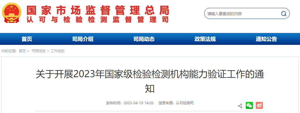 近日,市场监管总局发布通知,决定在部分检验检测领域组织开展2023年国家级检验检测机构能力验证工作。详情如下: