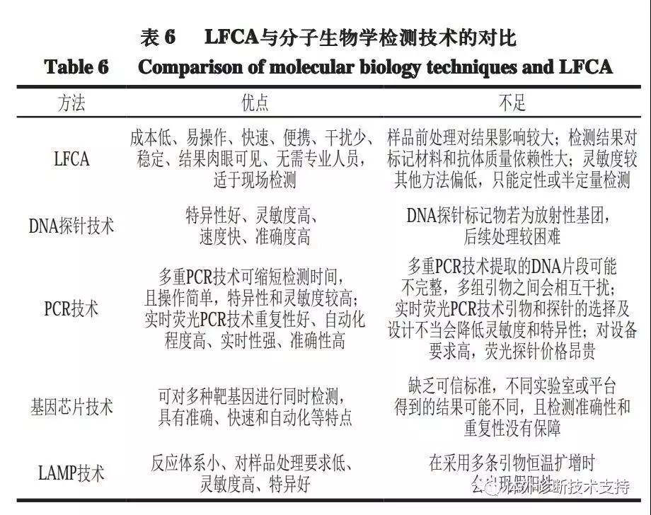 分子生物学检验技术是以核酸或蛋白质为分析材料,通过分析基因的结构、表达的变化和由此而导至的基因功能的改变,为疾病的研究和诊断提供更准确、更科学的信息和依据的一门技术。分子生物学检测技术包括PCR技术、环介导恒温扩增(loop-mediated isothermal amplification,LAMP)技术、生物发光检测法等。表6以这几种方法为代表与LFCA作比较分析。分析表明,LFCA与分子生物学检测技术相比,不需特定仪器及专业操作人员,检测时间短,不易出现假阳性和假阴性。但该方法灵敏度偏低且不能实现定量检测,是LFCA法的瓶颈问题,需要进行优化和改进。