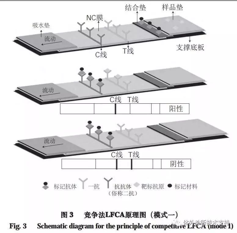 竞争法分两种模式,一种用于检测抗原,另一种是当抗原材料中的干扰物质不易除去或不易得到足够的纯化抗原时,用来检测特异性抗体。以胶体金标记为例,在第一种检测抗原的模式中,用胶体金标记一定量的靶标抗原并固定在结合垫上,T线与C线分别喷涂与靶标抗原特异性结合的抗体(一抗)以及抗种属特异性IgG的“抗抗体”:对于阴性样品,金标抗原随样品侧向流动,在T线处与一抗结合,在C线处与二抗结合,结果T线和C线均显现红色;对于阳性样品,样品中未被标记的靶标抗原和结合垫上金标的靶标抗原通过竞争与T线处的一抗结合,样品中的靶标抗原越多,结合在T线上的金标抗原越少,显色也就越浅,而过量的金标抗原与C线处的二抗结合,故只有C线显现红色(图3)。 在第二种检测抗体的模式中,将抗体用胶体金标记在结合垫上,T线和C线分别包含抗原与载体分子(通常为牛血清白蛋白(bovine serum albumin,BSA))的结合物以及抗种属特异性IgG的“抗抗体”。样品中的靶标抗体和结合垫上的金标抗体共同竞争T线上的抗原与载体分子的结合物:对于阴性样品,结合垫上的金标抗体分别与T线和C线上的固定物反应结合,使T线和C线均显现红色;对于阳性样品,样品中的靶标抗体会优先和T线上的抗原与载体分子的结合物特异性结合,样品中的靶标抗体越多,结合在T线上的金标抗体就越少,显色也越浅,而过量的金标抗体与C线处的二抗结合,故只有在C线处显现红色(图4)。