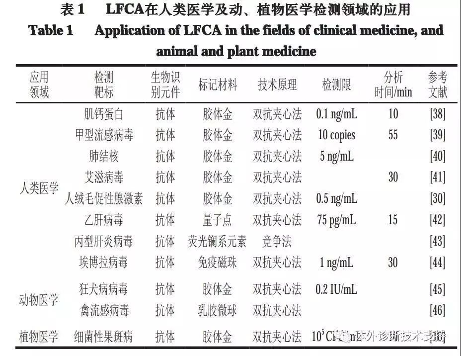 在人类医学及动、植物医学检测领域的应用在LFCA建立并发展的早期,人们就将研究的目的放在了其在人类疾病诊断、预警、生理生化指标的分析上。后来,随着畜牧养殖业和种植业的不断发展,动植物疫病对其危害也不断加剧。迄今为止,有大量试纸已经成功应用于人类肿瘤性疾病、病毒性感染、细菌性传染、动、植物性病毒病、细菌病、寄生虫病等的快速检测上。 由表1可见,目前LFCA在医学领域应用甚广,涉及人类、动物和植物,且以胶体金标记双抗夹心法为主,其检测灵敏度可达ng/mL级,分析时间均在1 h之内。由于胶体金易于制备、成本低、颜色形成较快、不易褪色,加上医学领域检测靶标抗原大都是大分子物质,含有较多的抗原位点,使胶体金标记双抗夹心法被高度的应用在人类医学及动、植物医学检测领域,为医学发展作出了巨大贡献。胶体金作为层析试纸标记材料由来已久、应用甚多,更多更高效的标记材料及方法值得研究者继续并深入研究以取得更大成就。