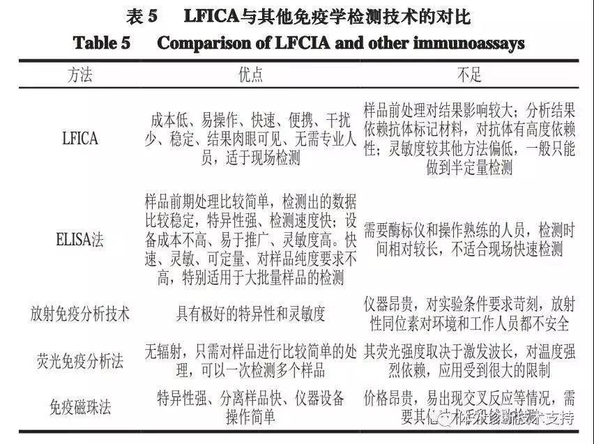 免疫学检测技术是以抗原与抗体的特异性反应为基础建立的,不同的检测物质有其特异的抗原,并能激发机体产生相应的特异性抗体。基于免疫技术的检测方法以目标菌的表面抗原或分泌毒素等为检测靶点,因此是一种可用于检测细菌或芽孢的方法。这种方法已广泛应用于食品中致病菌的检测,包括ELISA、免疫磁性分离技术、放射免疫分析技术、免疫荧光技术等。表5以这几种方法为代表与LFICA作比较分析。分析表明,LFICA相较其他免疫学检测手段,不需特定仪器或复杂技术手段辅助,节省成本,且对检测环境要求不高,适合现场快速检测。