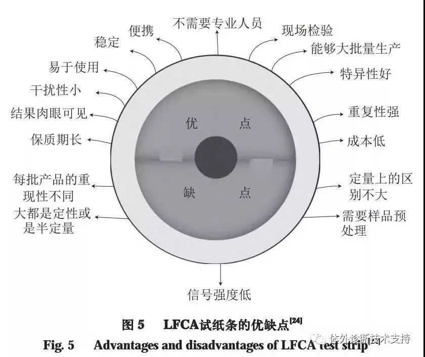 LFCA不需要专业操作人员和昂贵的仪器设备即可实现对抗原、抗体和半抗原等各种分析物的定性和半定量检测,在劳动力稀缺的地区起着重要作用,还可在短时间内对几种化合物进行同时检测。图5对LFCA试纸检测技术的优缺点进行了总结。
