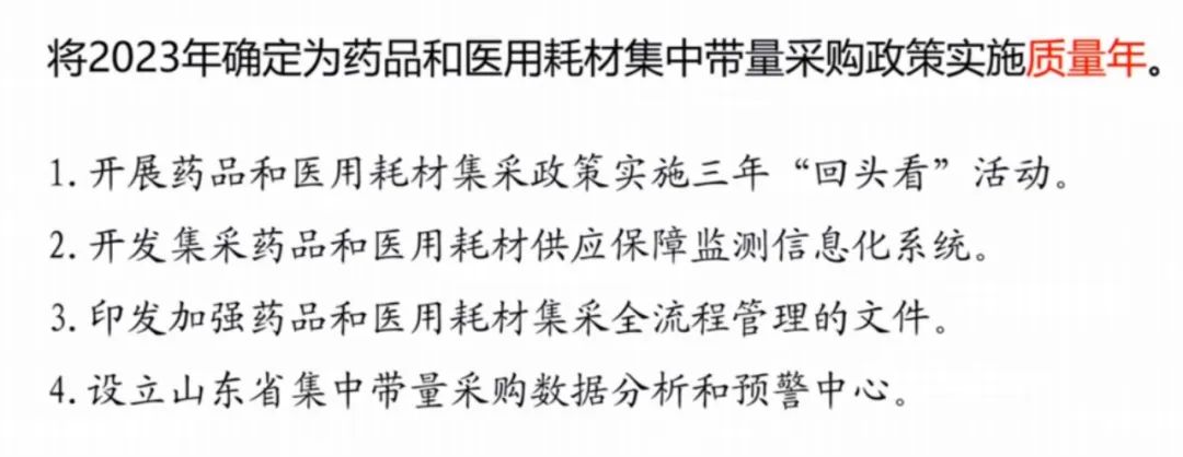 从山东的方案我们也可以大概了解政府对于2023年的集采质量年的工作期许——对既往文件中有关集采落地的政策要求执行不到位的环节加以流程优化,使得集采过程中,供需双方的义务和权利都能更好地得到保障。