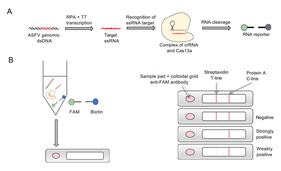 Wang等[7]利用RPA结合CRISPR/Cas12a系统,针对ASFV的保守基因p72进行RPA扩增,将扩增子与Cas12a/crRNA混合。当体系中存在ASFV靶序列,就会与Cas12a/crRNA形成三元复合体,激发其反式切割活性,切割体系中的报告探针,从而产生荧光信号,见图2。作者发现RPA结合CRISPR/Cas12a检测灵敏度比商品化的qPCR试剂更高。且该方法特异性很高,只能检测出ASFV,而对其他病毒样本均无反应。 图2. CRISPR-Cas12a对ASFV检测的应用示意图 Ren等[8] 开发了一种基于RPA-CRISPR/LwCas13a的核酸检测方法来诊断ASFV。作为一种高度灵敏的方法,该法通过RPA扩增后对扩增子进行转录,体系中存在ASFV转录靶标时就会与Cas13a结合,激活其反式切割活性,并切割报告探针产生荧光信号,检测原理见图3A,该方法可以检测到低至单个拷贝的ASFV质粒和基因组DNA。同时作者也开发了一种试纸条与RPA-CRISPR结合用于ASFV检测的方法,见图3B,具有与TaqMan qPCR相同的灵敏度。同样,RPA-CRISPR能够将ASFV基因组DNA与其他猪病病毒的DNA/RNA区别开,没有任何交叉反应。 图3. 基于RPA-CRISPR的横向流条检测示意图