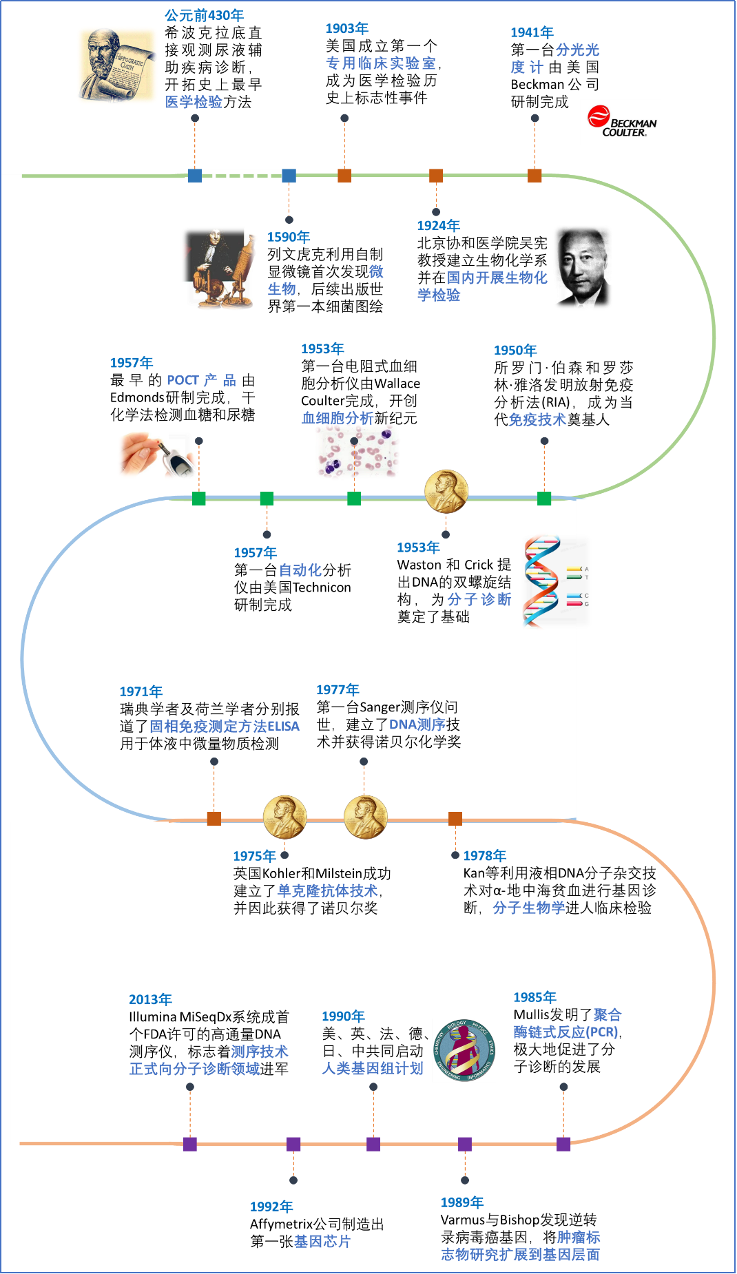 改革开放以来,我国IVD产业从无到有,从弱到强,从萌芽、初创到成长和高速发展,竞争不断加剧。面对越来越卷,越来越难的大环境,我们该如何更加主动的面对? 今天小编借中国生物技术发展中心的《2022体外诊断科技创新发展报告》之花献献佛,回顾IVD发展过程、剖析存在的问题并展望技术发展趋势,希望能陪各位战友共上高楼,望望天涯路。 知史以明鉴,查古以至今 ➣ 世界IVD发展史 体外诊断行业的发展伴随着生物化学、免疫学、分子生物学等领域的发展而发展,可分为3个发展阶段: 第一阶段 20世纪之前,显微镜的发明催生了以微生物镜检为主的传统形态学检验手段; 第二阶段 20世纪初期,酶催化反应及抗原抗体反应的发现为生化和免疫诊断奠定了根基,体外诊断逐步兴起; 第三阶段 20世纪50年代后,DNA 双螺旋结构、单克隆抗体技术、高通量测序技术等的运用推动了分子诊断及整个体外诊断行业的跨越式发展,在临床疾病预测、预防、诊断、治疗监测、预后观察和健康状态评价等方面,起到越来越重要的作用。 图 IVD发展史上的代表性事件 如果说前三次工业革命使得人类发展进入了空前繁荣的时代,但也造成了巨大的能源、资源消耗,付出了巨大的环境代价。进入第四次工业革命,互联网大数据、人工机器人、3D打印技术蓬勃发展,以这些为核心的智能化技术给体外诊断产业带来了新的机遇、新的理念,实验室从自动化向信息化、智能化以致成为“绿色实验室”方向逐步发展。体外诊断产业的竞争已不是单方向市场,而是多元的、多广度的、多维度的全球竞争。体外诊断的发展与创新将继续改变着我们的现在和未来。 ➣ 国IVD发展简史 中国体外诊断产业起步相对较晚,新中国成立时,就有部分检验人员和研究人员投入体外诊断的研发工作中,但由于条件限制,检验技术水平还比较低,体外诊断没有实现真正意义上的产业化。直到20世纪70年代末,中国开始进行改革开放,体外诊断技术成果逐步向产业转化。 中国体外诊断产业的发展经历了逐步从雏形的形成到产业的高速成长,从手工作坊式研制到仪器和试剂一体化的全自动系统,从国外引进到部分产品实现进口替代,从无产业监管到规范化管理,企业产品加速开发,产业规模也逐步扩大和完善的过程。 从1978年至今,中国体外诊断产业,呈现出产业从无到有,从弱到强,从萌芽、初创到成长和高速发展,竞争不断加剧。产业结构升级的过程,大致可以分为初创期(1978—1990年)、成长期(1991—2000年)、快速增长和竞争加剧期(2001年至今)三大阶段。 01 中国体外诊断产业初创期 (1978-1990年) ▸1978年,成立国家医药管理局。当时,体外诊断试剂多为实验室自研自用,只有为数不多的几家医化所和试剂站生产单位(如上海市立医学化验所、湖南化剂室等),并没有成型的生产和销售组织。全国各大医院开展的检验项目也仅有二三百项。 ▸1980年,第一套国产细菌编码微量发酵管进入实验室。 ▸1981年,第一台国产半自动生化分析仪在上海医分厂诞生。 ▸1982年,卫生部临床检验中心于北京成立。随后,各省(区、市)也相继成立了地方的临床检验中心,极大地推动了中国体外诊断产业化的发展进程。 ▸1983年,上海血液中心成功研制出了采血袋和血浆袋,结束了用盐水瓶采血的历史,此后第二军医大学朝辉制药厂、山东威高(前身威海国营医疗器械厂)等生产的血袋产品陆续进入市场。 ▸1988年,解放军军事医学科学院基础医学研究所正式创建北京四环生物工程制品厂,并独家获得中国最早乙肝五项 ELISA试剂的生产文号和新药证书。同年,全国医用临床检验实验室和体外诊断系统标准化技术委员会成立,对中国体外诊断产业的规范化管理起到了促进和推动作用,标志着我国体外诊断产业基本形成。 02 中国体外诊断产业成长期 (1991—2000年) ▸90年代初,中国体外诊断试剂的生产以生化和免疫为主,除进口代理外,依托一些有实力的大专院校和研究所,本土生产型体外诊断企业不断涌现,带动了中国体外诊断产业的发展和初步形成,促进了商品化的成套试剂盒进入实验室,逐步取代了手工制配试剂,提升了实验室检测结果的可靠性。 ▸1998年,国家药品监督管理局挂牌成立。中国的体外诊断产业进入国家标准化管理和质量监管体系,产业步入法制化发展轨道。 ▸2000年,卫生部颁发了《出血时间、凝血时间检验方法操作规程的通知》,明确要求取消手工法出、凝血时间检验。经过国家行政部门的干预和市场治理后,产业逐步完善,集中度也有所提高,中国体外诊断产业进入良性发展轨道。 03 中国体外诊断产业快速增长和竞争加剧期 (2001年至今) (一)外资主导与市场竞争加剧的第一个十年 进入21世纪以来,全球体外诊断产业高速发展,中国跻身为全球体外诊断发展最快的国家之一。2001年,中国正式加入 WTO成为世贸组织成员,中国体外诊断产业随之步入高速增长期,进入全新的阶段。部分外资企业洞察到中国市场发展的巨大潜力和需求,开始大规模进入中国市场,其产品主要通过试剂仪器一体化的封闭模式投放市场,同时具备国内所没有的先进检测技术和设备,以技术门槛优势快速扩大市场规模,并逐步在三甲医院等高端市场占据主导地位。与此同时,国内企业也开始了技术追赶,部分企业(如迈瑞医疗、科华生物等)所生产的试剂仪器一体化产品质量水平大幅