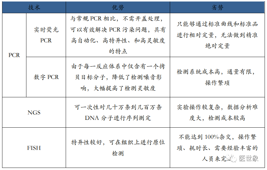 伴随诊断需要通过对样本进行基因测序等分析手段进行药物受体作用位点的确定,目前常用样本类型为组织以及体液。 对组织进行分子分析的技术称为组织活检,具体是指应诊断、治疗的需要,从患者体内切取、钳取或穿刺取出病变组织,对其进行分子分析。 对肿瘤伴随诊断来说,肿瘤组织活检是获取肿瘤 DNA 的金标准。对液体进行分析的技术称为液体活检,具体是指通过对患者的体液中的分析物(CTC、cfDNA、ctDNA 等)进行分子分析,以指导患者的个性化治疗及预后。 组织活检与液体活检技术优缺点对比 从临床应用上看,组织活检与液体活检各有优劣。虽然目前基于液体活检的肿瘤伴随诊断近年来处于蓬勃发展之中,但并非意味着其已经能取代组织活检技术,两者合作互补或许能大大提高诊断效率,减少过度治疗。随着液体活检技术不断发展,未来基于液体活检的肿瘤伴随诊断或将进一步替代组织活检技术,成为伴随诊断检测的主力军。 伴随诊断主要基因测序方法 伴随诊断是通过基因测序等手段进行药物受体作用位点的确定,随着靶向药的应用推广,伴随诊断逐步确立起指导治疗的重要地位。在伴随诊断所用检测技术中,PCR、NGS、FISH 是目前市场上应用最广泛的技术,其各有优劣,在各大伴随诊断企业中均有分布。 (一)PCR PCR(聚合酶链式反应)是一种用于放大扩增特定 DNA 片段的分子生物学技术,可以看作是生物体外的特殊 DNA 复制,其最大特点是能将微量的 DNA 大幅增加。在存在DNA模板、引物、dNTPs、适当缓冲液 (Mg2+) 的反应混合物中,在热稳定 DNA 聚合酶的催化下,对一对寡核苷酸引物所界定的核酸片段进行扩增,这种扩增是以模板 DNA与引物之间的变性、退火、延伸三步反应为一个周期,循环进行,使目标 DNA 片段得以扩增。 普通 PCR 原理图 最初的普通 PCR 技术只能通过对靶基因进行扩增,然后采用琼脂糖凝胶电泳对产物进行分析,实现简单的定性分析,这是第一代 PCR。鉴于(1)第一代 PCR 采用的核酸燃料对实验人员及环境造成较大伤害,(2)PCR 完成之后开盖检测易污染造成假阳性结果,(3)检测耗时长且操作麻烦易出错及(4)只能做定性检测,二代 PCR 得以发展并成为目前国内 PCR 技术主流。第二代 PCR 就是荧光定量 PCR 技术(Real-Time PCR),也叫做 qPCR, 是指通过应用荧光染料或荧光标记的特异性探针(如 Taqman Probe),在 PCR 反应体系中加入荧光基团对聚合酶链反应产物进行标记跟踪,实时监控反应过程,结合软件对荧光信号进行分析,实现基因检测的定性和定量分析。qPCR 常用于传染病病原体检测,疾病耐药基因研究,药物疗效考核,遗传疾病诊断。随着反应循环次数的增加,被扩增目的基因片段呈指数增长,通过实时检测对应的随扩增而变化荧光信号强度,求得 Ct 值,利用已知模板浓度的标准品作对照,即可得出待测标本目的基因数。由于 rPCR 定量过程通过 Ct 值间接反映,因此称为第二代 PCR。 实时荧光定量 PCR 原理图 应用荧光染料:SYBR green:在 PCR 反应体系中,加入过量 SYBR 荧光染料,SYBR 荧光染料特异性地掺入 DNA 双链后,发射荧光信号,而不掺入链中的 SYBR 染料分子不会发射任何荧光信号,从而保证荧光信号的增加与 PCR 产物的增加完全同步。 应用特异标记探针:Taqman Probe:PCR 扩增时在加入一对引物的同时加入一个特异性的荧光探针,该探针为一寡核苷酸,两端分别标记一个报告荧光基团和一个淬灭荧光基团。探针完整时,报告基团发射的荧光信号被淬灭基团吸收;PCR 扩增时,Taq酶的 5’-3’外切酶活性将探针酶切降解,使报告荧光基团和淬灭荧光基团分离,从而荧光监测系统可接收到荧光信号,即每扩增一条 DNA 链,就有一个荧光分子形成,实现了荧光信号的累积与 PCR 产物形成完全同步。 荧光染料 VS 荧光探针 随着 PCR 系统的进一步发展已经对检测,一种具备较高灵敏度和特异性的数字PCR 技术开始被广泛应用于肿瘤临床检测和科学研究中。数字PCR(Digitai PCR,dPCR)是一种新兴的核酸检测技术,通过将每个核酸分子分配到一个独立的空间内,避免选择性扩增对扩增结果的干扰,可实现核酸模板绝对定量、稀有突变检测、拷贝数变异、DNA 甲基化、基因重排等检测功能。由于数字 PCR 可以实现直接定量分析,被称为第三代 PCR。 数字 PCR 原理图 通过稀释样品 DNA 到对应的检测孔中,经过 PCR 扩增之后,向每个孔里加入特异性荧光探针与产物杂交,然后直接计数样本中突变型和野生型等位子的数量。dPCR 常用于大量正常细胞群中检测少数含突变的细胞,主要应用于突变分析、等位基因缺失、混杂 DNA 的癌症检测等等。 三代 PCR 的技术优劣 (二)NGS NGS(高通量测序技术)是指通过模板 DNA 分子的化学修饰,将其锚定在纳米孔或微载体芯片,利用碱基互补配对原理,在 DNA 聚合酶链反应或 DNA 连接酶反应过程中,通过采集荧光标记信号或化学反应信号,实现碱基序列的解读,一次性可完成几十万至上百万序列的测定。 NGS 是基于 PCR 和基因芯片发展而来的 DNA 测序技术。一代测序为合成终止测序,而二代测序开创性的引入了可逆终止末端,从而实现边合成边测序。二代测序在 DNA复制过程中通过捕捉新添加的碱基所携带的特殊标记(一般为荧光分子标记)来确定DNA 的序列。 目前高通量测序的主要平台代表有罗氏公司(Roche)的 454 测序仪(Roch GS FLX sequencer),Illumina 公司的 Solexa 基因组分析仪(Illumina Genome Analyzer)和 ABI的
