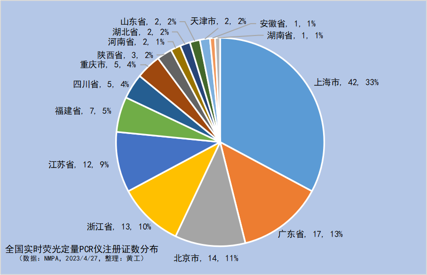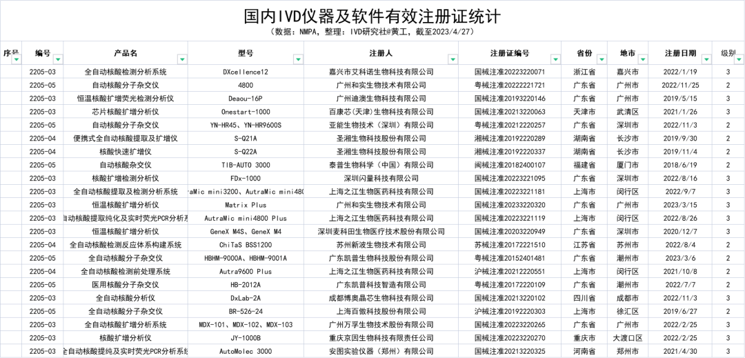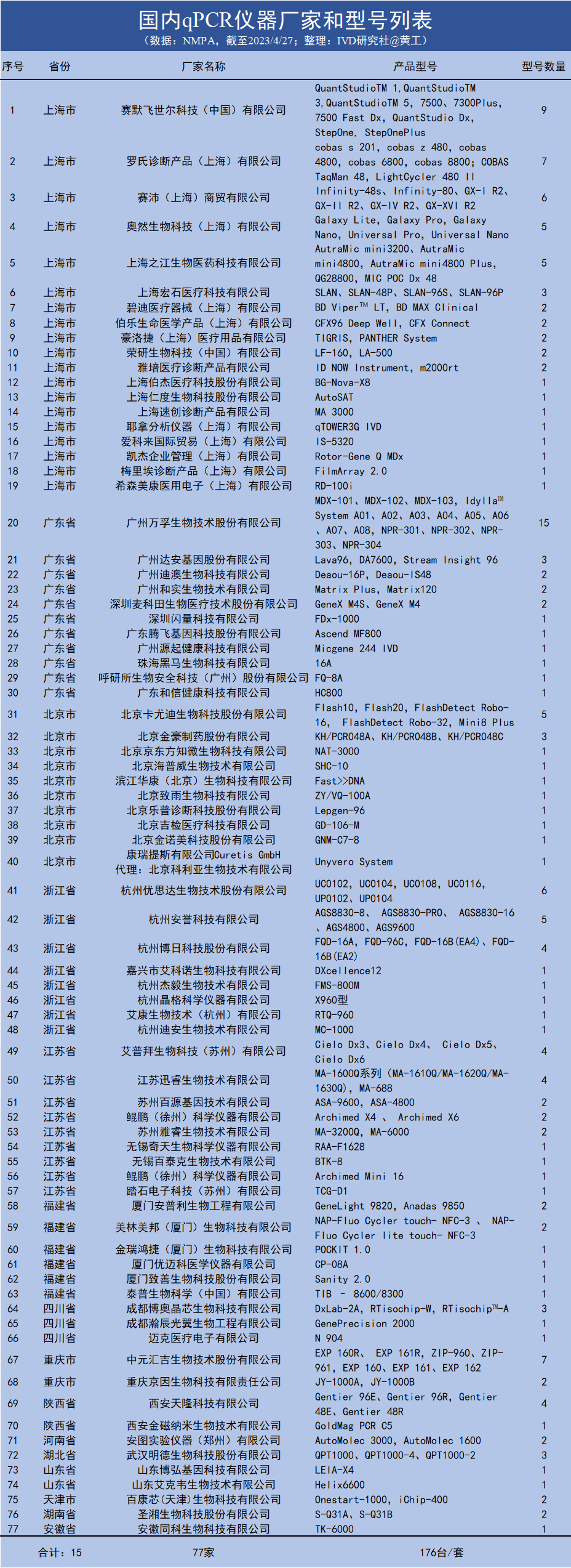 到NMPA数据库,搜索“核酸”“PCR”“扩增”,可得202条有效注册证,包含进口。基于此,进一步整理,可视化之后,得到下方图表成果。这202条注册证,包括3类产品:实时荧光定量PCR仪(128个)、核酸扩增仪(57个)、核酸分子杂交仪(27个),后两者不写文章了,上传到知识星球,感兴趣可以加入下载。 经过整理后,到2023年4月底,国内qPCR仪器分布于15个省份,来自于77个厂家,共有176个型号。其中,上海市19家,主要是众多外资在上海设立总部;广东11家,北京10家。qPCR仪器第一梯队:罗氏、赛默飞(ABI);第二梯队:宏石、博日、雅睿等。 01:安图生物 [1] 本文核心数据:国家药监局数据查询中心 [2] 中国体外诊断产业蓝皮书,2015~2020年卷 [3] 临床检验装备大全:仪器与设备 [4] 雅睿生物、博日科技招股书,国海证券、东方财富证券 |
