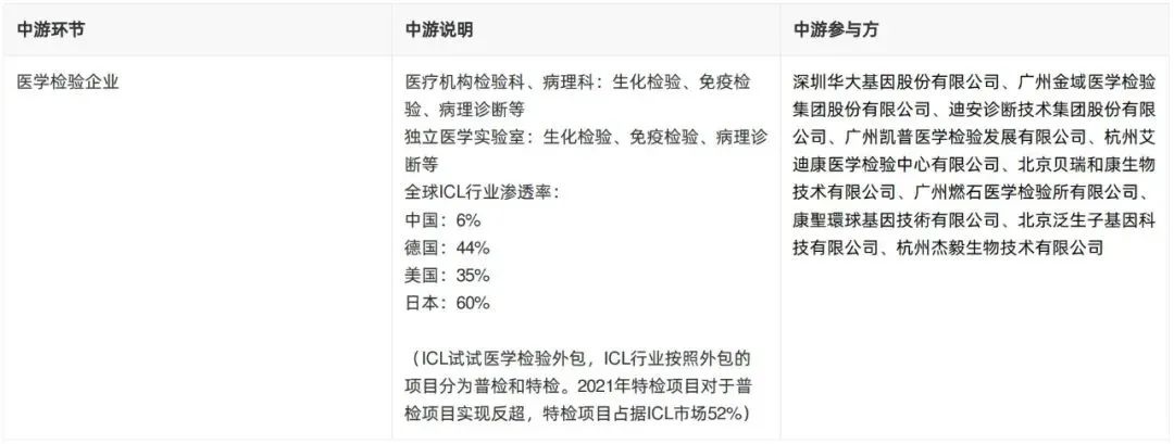 IVD对我而言是意外也是缘分 近段时间,时不时有做医疗投资的朋友跟我说,虽然我不是做金融行业的,但是我的文章经常是带有金融属性的。 其实我对金融的兴趣由来已久,最早在高三的时候,从第一次看到一篇介绍巴菲特的文章开始,就对金融产生了浓厚的兴趣。那之后我陆续看过几十本金融相关书籍,大部分是在大一的时候看的。 股票、外汇、期货等相关金融书籍,或多或少我都曾涉猎过,但是最感兴趣的还是股市,我开股票账户也挺早的,大一的时候就有了自己的股票账户,随即就买了几只股票,所以虽然我炒股很少,但是股龄已经有14年了。 我和金融、IT、电商这三个行业都有很深的缘分,金融是兴趣,IT是我大学最主要的专业课程,我大学学的是信息管理,就是计算机和管理学,我们学校是偏计算机的。而电商,我曾有过八年的创业经历。 经常有朋友问,为什么我没有从事IT或者金融相关行业?因为我大学毕业那会儿,一心只想创业,手上又没钱。IT和金融的创业门槛都很高,最后迫于无奈,我选择了门槛相对低的电商领域进行创业,而且做的还是电商领域门槛相对较低的女装类目。 我经常也会思考,我的那些基于兴趣或者缘分的学习经历、创业经历,对于我未来的人生事业算一种积累吗? 2008年年初的时候,我为自己的人生提出了金融、新能源、IT三个方向,目前来看,当时的我还是很有预见性的,只可惜我的这些预见似乎并没有给我的未来铺平道路。 后来创业做电商,我觉得我是在“曲线救国”,早晚还是会回到我的IT主航道的,没想到还没熬到回归IT主航道,我就已经转型了IVD。这个选择对我而言很难很难,所以我其实犹豫过很多年。 第三方医学检验实验室对我而言陌生又熟悉 第三方医学检验实验室也叫独立医学实验室(Independent Clinical Laboratory,ICL),按理说这应该是我比较熟悉的一类医疗机构,因为我在第三方医学检验实验室工作过。 我前面写过的金域医学、迪安诊断、达安基因也都算得上第三方医检实验室中的代表,ICL龙头企业当中,目前可能也就艾迪康我还没有系统写过,艾迪康也是一个挺有话题性的ICL企业,有过“三闯”IPO的经历,最近一次的IPO申请已经通过了,应该也快上市了。 不过我发现,虽然同样是第三方医学检验实验室,大家的认知中金域、迪安、艾迪康似乎更符合ICL的形象,像华大基因、贝瑞和康虽然核心业务也都包含ICL,但很多人讨论ICL的时候,容易忽视它们的存在。可能达安、华大做特检居多,特检毕竟是近些年才兴起的。 这两天在学习ICL的过程中,莫名觉得有点吃力,我以为这是我熟悉的行业,但可能我熟悉的只是一个个企业名字,还有基本的市场格局。对于ICL行业的发展逻辑,在写这篇文章之前,其实我并不了解。 临床诊断检测简介 临床诊断检测是在实验室进行的医疗检测,旨在提供有关某一人士健康状况的资料。这一资料可协助医生针对病患护理作出精确及个人化的诊断决策。 根据Frost & Sullivan的资料,大约70%至80%的临床决策乃以某些形式的实验室检测为基础。此外,临床检测亦能够协助制药及生物技术公司研发新药及疫苗,支持私营企业雇主检测其雇员的酒精及药物滥用情况,并帮助保险公司评估与申请人健康状况有关的风险。 临床诊断检测通常由三类提供商进行,即医院实验室、第三方医学检验实验室及其他(如医生办公室、疗养院及门诊手术中心),其中,就收益及检测量计,医院实验室为最大的医学检验服务提供商。 医院实验室通常仅为其自身住院病人提供检测,而另一方面,ICL独立于医院,自大量医院及研究机构接收样本进行分析。相较于医院实验室,ICL的规模通常较大。ICL通常拥有更先进的设备及技术上更训练有素的实验室人员,使得样本能够以更具成本效益的方式进行专业检测及大量测试。 根据Frost & Sullivan的资料,医院实验室的测试目录通常拥有约800项测试项目,大部分为普检项目,可满足一家医院就诊患者的基本诊断需求,而ICL通常能够提供检测1,000多项测试项目,包括涵盖专业特检在内的各种检测类型。 像金域医学这样的头部ICL企业,能提供的检测项目就更多了,根据金域医学2022年年报显示,金域医学拥有检验技术79类,2022年新开发项目超过600项,在推动产品持续升级迭代的同时,对外提供服务项目总数超过3600项。 迪安诊断提供3000余项医学检测项目,包括分子诊断、病理诊断、生化发光检验、免疫学检验、理化质谱检验及其他综合检验等从常规到高精尖的检测项目。2022年,迪安诊断新开检测项目270个。 检测项目数据上,表现最好的没想到是艾迪康,截止到2022年年底,艾迪康的检测组合包括4000多种医疗诊断检测,其中包括1700多种普检及2300多种特检。 第三方医学检验实验室行业定义 独立医学实验室(Independent Clinical Laboratory)简称ICL,也称第三方医学实验室。一般来说是指获得了卫生行政部门许可行的、具有独立法人资格的、专业从事医学检测的服务性医疗机构。 第三方医学检验实验室行业分类 第三方医学检验实验室行业特征 行业发展和企业普及便捷。由于ICL业务标准化,在各地开展业务普及较为容易。实验样本的生理特点决定了检验必须快速完成,考虑到单个实验室服务半径相对较小,ICL公司需要达到足够广阔的业务布局以确保辐射范围,实验室的数量和覆盖范围决定了公司的业务渗透率。以ICL行业巨头为例,LabCorp和Que