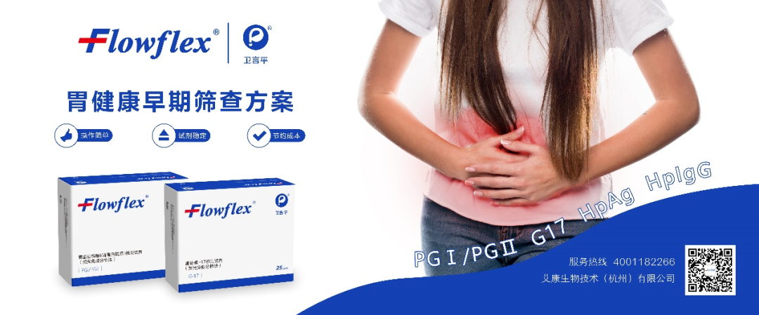 艾康生物Flowflex® 胃健康早筛系列,涵盖胃蛋白酶原Ⅰ/胃蛋白酶原Ⅱ、胃泌素-17、幽门螺杆菌IgG抗体、幽门螺杆菌抗原检测。可以应用于各级医院检验科、门急诊、体检中心、临床科室等,作为胃癌筛查手段有力支持国家慢性病综合防治行动,助力胃癌的早诊早治工作。 [1]中华检验医学杂志, 2023,46(4) : 347-359
