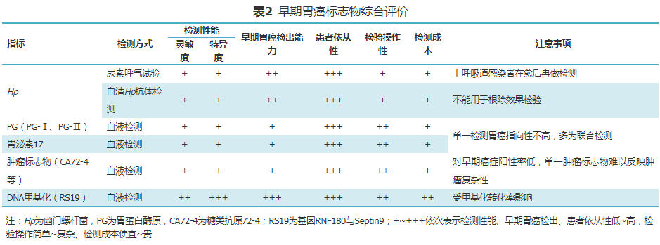 Hp感染是胃癌防治中可控的危险因素,可通过UBT和血清Hp抗体检测来评估胃癌高危人群。UBT中的C13检测辐射量小,更适用于儿童和孕妇群体。血清Hp抗体在Hp根除后仍能持续存在半年以上,不适用于疗效监测。PG主要检测萎缩性胃炎,G-17检测覆盖胃溃疡、慢性萎缩性胃炎、胃癌等多种胃肠道疾病。Hp感染患者的血清PG-I或PGR呈降低表达,建议根除Hp后,再做胃癌癌前病变的PG筛查。PG和G-17联合检测对胃部疾病诊断价值高,可用于胃癌风险提示。CEA、CA19-9、CA72-4等作为胃癌辅助诊断肿瘤标志物,对早期胃癌的诊断价值有限。监测上述肿瘤标志物的动态变化有助于胃癌预后评估,且CEA、CA19-9、CA72-4联合检测可降低胃癌漏诊率。RS19基因甲基化可用于检测早期胃癌,阳性受检者应及时进行胃镜检查;RS19基因甲基化联合肿瘤标志物可进一步提升胃癌诊断灵敏度。此次共识中对早期胃癌检测的标志物进行综合评价,包括检测性能(灵敏度、特异度)、早期胃癌检出能力、患者依从性、操作简便性、检测成本等(表2),供临床诊断选择参考。