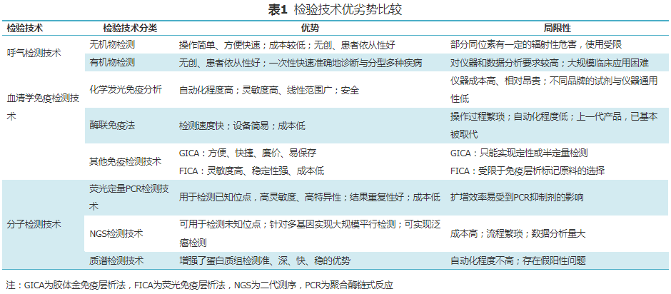 | 胃癌是我国发病率第一的消化道恶性肿瘤,根据《2020全球最新癌症负担数据》显示,2020年我国胃癌新发478508例,发病率约33.06/10万,居中国恶性肿瘤发病率第2位;死亡373789例,死亡率约25.82/10万,位列我国恶性肿瘤死亡率第3位。此外,我国胃癌患者还呈现出年轻化的趋势,流行病学统计显示,与30年前相比,19~35岁的胃癌患者整整翻了一番。胃癌的发生是一个渐进性的过程,从最初的胃炎、癌前病变到胃癌的发生需经历3~5年,甚至更长。但一般在这过程中无明显的症状,发现时大都处于中晚期。胃癌的预后与诊治时机密切相关,目前我国发展的胃癌约90%属于进展期,进展期胃癌即使接受了外科手术,5年生存率仍低于30%。而早期胃癌治疗后,5年生存率可超过90%,甚至达到治愈效果。据数据统计显示,胃癌患者的中位总生存时间仅为16个月,为了延长患者5年生存率,早期发现、早期治疗无疑是解决问题的关键。因此,提升我国早期胃癌检验技术水平、提高早期胃癌筛查覆盖率是降低我国胃癌死亡率和提升早期胃癌检出率的重要措施。近日,《中国早期胃癌筛查检验技术专家共识》在中华检验医学杂志发布。  共识中分析了近年来已用于临床早期诊断胃癌的相关检验技术,探讨了早期胃癌相关标志物在早期胃癌诊断中的临床应用及特点,并提出了共识性意见,旨在为患者、临床医师及卫生行政管理部门提供规范、临床应用价值高的检验技术指导和筛查策略。呼气检测技术主要检测Hp感染,可用于早期胃癌风险评估和胃部健康监测。血清学免疫检测技术可用于多种血清肿瘤标志物及胃特异性蛋白的检测,以辅助早期胃癌的筛查。荧光定量PCR检测技术适用于现阶段早期胃癌检验技术的发展需求;NGS目前更多应用于前瞻性临床试验;质谱检测技术可用于早期胃癌差异蛋白的筛选。本共识详细分析了早期胃癌的检验技术方法,侧重于预防和早检。各种常见的早期胃癌检验技术各有优势和局限性(表1)。