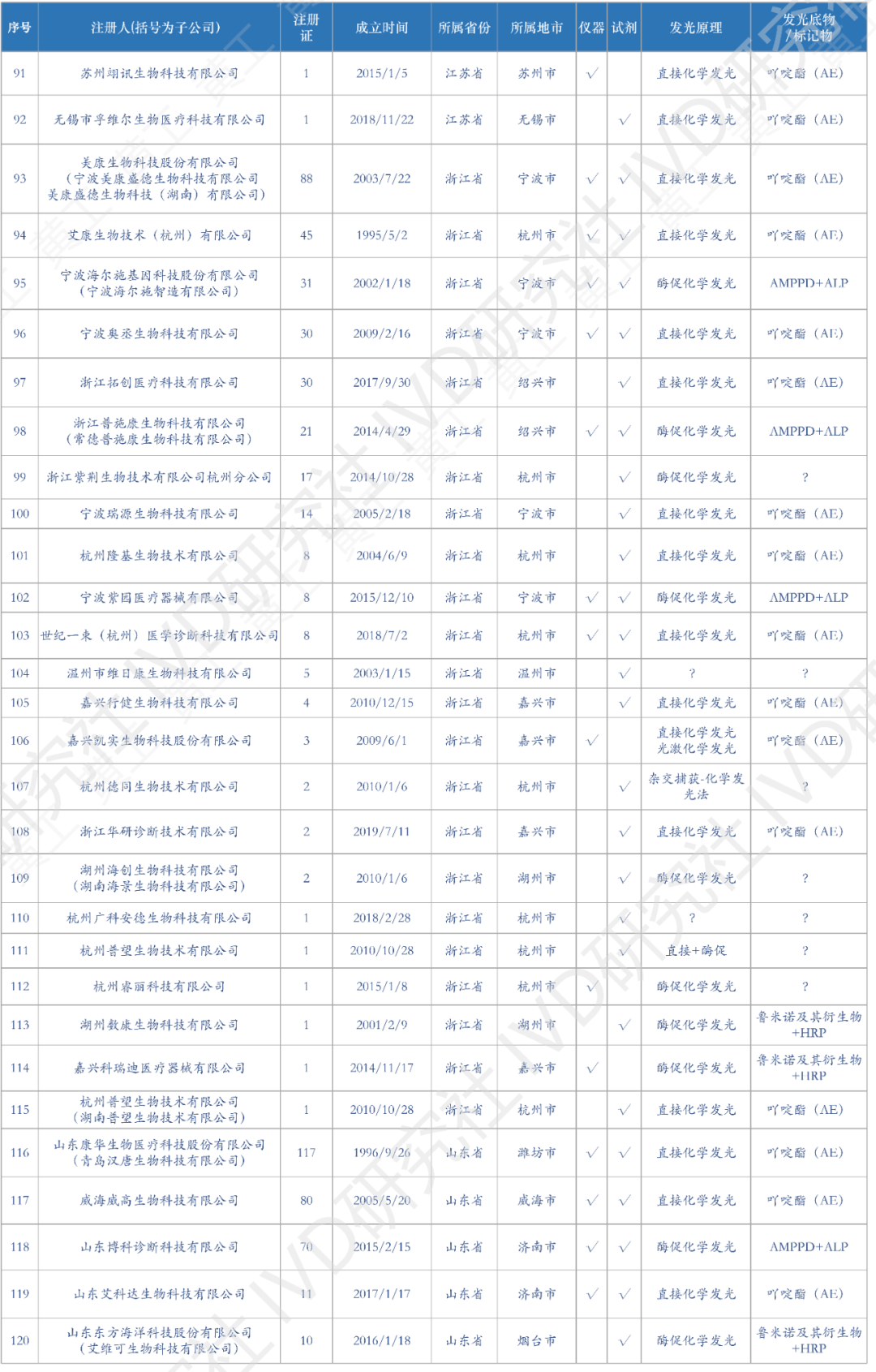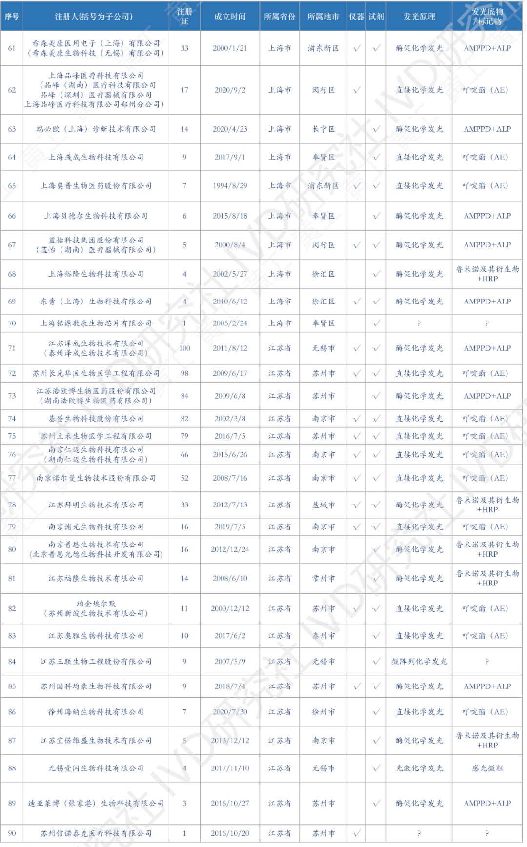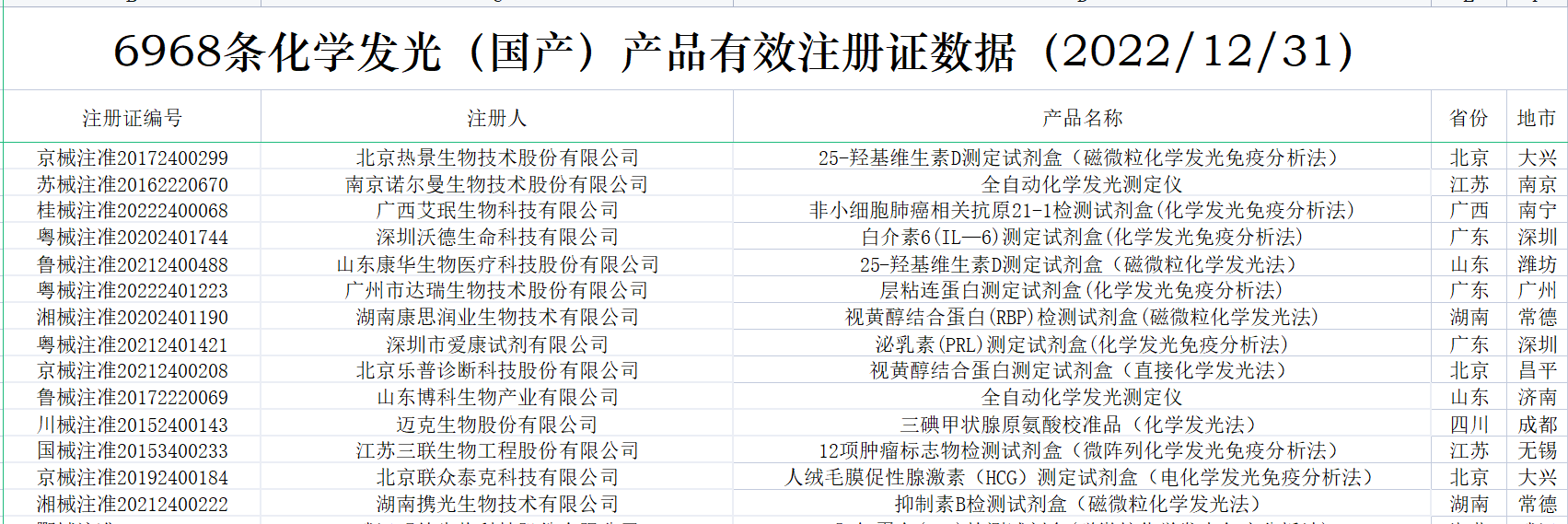 花了一个多月时间,终于把国内化学发光有效注册证数据,全部整理、清洗好了。到2022年12月31日,国产化学发光注册证共6968张;到2023年4月5日,进口化学发光注册证642张。两者加总,目前国内化学发光注册证,大约7600张,包括仪器、试剂、质控品、校准品等。去年统计的国产注册证,到2023Q1可能有增有减,但数据差异不会太大也不影响本文论述。这7600张注册证,登录国家药监局数据库,医疗器械板块,输入“化学发光”整理可得。(↑:目前国内化学发光有效注册证数据,国产+进口,总计7600条)基于上述数据,梳理出国内市场,化学发光相关企业共309家。这309家企业,包括子公司在内,很多不仅从事化学发光业务,也有IVD其他板块的,但都和化学发光有关,就一并整理了。另外,还对这309家企业,成立时间、所属省区市、母公司(控股公司)、业务包含仪器/试剂、发光体系等重要内容,做了进一步的分析整理,基于此表,可一览全国化学发光版图。(需要上表的朋友,可加入文末黄工的知识星球,有很多干货资料供下载,有技术群供交流)
