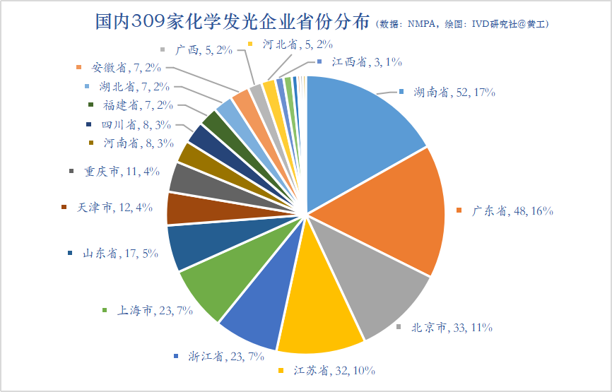 先来看个全貌。国内309家化学发光企业,湖南52家,占17%;广东48家,占16%;北京33家,占11%;江苏32家,占10%;浙江和上海,均为23家,各占7%;山东17家,占5%;天津12家,占4%;重庆11家,占4%;河南和四川,均为8家,各占3%;福建、湖北、安徽3省均为7家,各占2%;广西和河北各5家,分占2%;江西和陕西各3家,占1%;吉林2家,云南、黑龙江、贵州各1家。这些数据,包含国产、进口,也包括子公司在内。湖南化学发光企业数TOP1,主要是其他省市企业,到长沙、湘潭、常德等地注册了子公司。这309家发光企业,都用哪种发光体系呢?超过一半的企业,采用酶促(间接)化学发光法,163家,占53%;有1/3的企业,采用直接化学发光法,98家,占32%;电化学发光8家,仅占2%;光激化学发光6家,仅占2%;直接法、酶促法都兼容的,有8家,占3%,主要是化学发光CMDO/OEM企业;另外还有25家,未准确表述自家产品化学发光体系的,黄工查询药监局数据库、企业官方公众号、专利数据库等,均未获取到发光体系有关信息。对上图进一步分析,目前国内主流发光体系(发光底物+标记物)为:AMPPD+ALP和吖啶酯(AE)。163家采用酶促化学发光的企业,有109家的发光体系为AMPPD+ALP(碱性磷酸酶),占66.87%;98家采用直接化学发光的企业,有92家的发光体系为吖啶酯(AE),占93.88%。 大家都知道,化学发光是封闭系统,有仪器投放医院,是试剂上量、持续盈利的根本支撑。那这309家企业,仪器/试剂业务,各家都是怎样的呢?总的看,309家化学发光企业中,注册有仪器的166家,占53.72%;注册有试剂的254家,占82.2%;同时拥有化学发光仪器和试剂的,则有116家,占37.54%。 那合并子公司,实质运营的化学发光企业主体(母公司),以及国内化学发光版图是怎样的?以下内容,是本文的核心。我们将会看到,目前国内IVD最大市场份额,化学发光赛道都有哪些实力玩家。信息整理,难免有错漏,还望相关厂家朋友,多多包涵,多多指正。