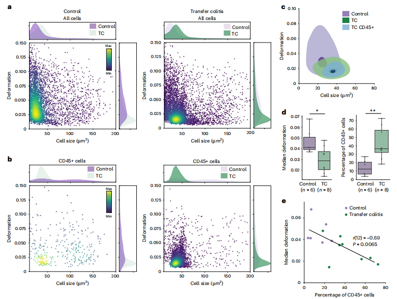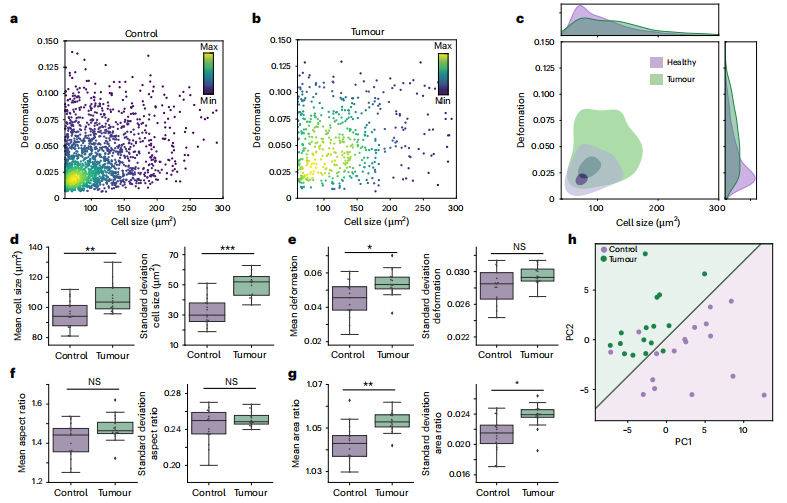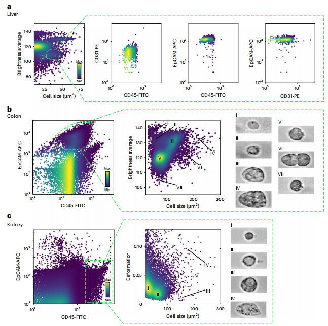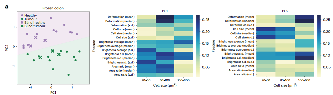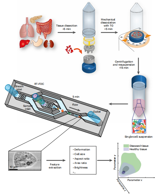 图片来源:Nature biomedical engineering 主要内容 组织单细胞物理表型检测概述 研究团队使用了组织研磨机,这是一种基于反向旋转的研磨齿排的机械解离装置(如下图),组装到Falcon管中。该设备自动执行预定序列的交替切割和研磨步骤,以从固体组织中分离单个细胞。总共使用TG或常规酶促方案处理了10种不同的小鼠组织进行比较。大多数组织的存活率为70-90%;细胞产量类似于酶解。机械离解的主要优点是处理时间不到5分钟,比酶促方案大大缩短。提取的速度有助于保存生物化学和生物物理表型。 接下来,使用RT–FDC对提取的单细胞进行分析。在RT-FDC测量中,可根据图像实时计算出几个物理参数,即形变、细胞大小、亮度、亮度标准差、纵横比和面积比。此外,荧光模块可用于检测细胞表面标记物的表达。 物理表型方法示意图。 图片来源:Nature biomedical engineering 小鼠组织单细胞物理表型检测 从肝脏、结肠和肾脏提取的细胞的物理参数分布的示例如下图。这些簇中的每一个都由具有相似物理表型和表面标记表达的细胞组成。例如,具有类似物理性质的细胞簇(本例由平均亮度和细胞大小定义)主要由上皮细胞粘附分子(EpCAM)阳性细胞组成,这表明可以完全使用图像衍生的物理参数以无标签的方式区分上皮细胞群。 由于物理表型参数提供了额外的信息深度,RT–FDC可以区分不同的亚群。在结肠上皮细胞中,只根据亮度和大小即可鉴定出七簇细胞。类似地,在肾脏的白细胞(CD45+)群体中,根据细胞大小和变形参数发现了四个不同的簇。使用RT–FDC分选模式,可以根据图像衍生的参数分离这些细胞群中的任何一个,并通过例如RNA测序分析其分子信息。 小鼠肝脏、结肠和肾脏样本的细胞物理参数散点图。 图片来源:Nature biomedical engineering 通过细胞物理表型检测组织炎症 炎症性肠病(IBD),如克罗恩病和溃疡性结肠炎,是与上皮/粘膜屏障受损和免疫细胞激活/募集有关的肠道慢性炎症性疾病。IBD的一种实验动物模型是将幼稚的T细胞过继转移到Rag1缺陷小鼠中以诱导实验性结肠炎(转移性结肠炎)。 通过研究转移性结肠炎过程中结肠细胞物理表型的变化可知,形变与细胞大小的散点图表明疾病和健康组织之间存在差异(图a)。总的来说,转移性结肠炎样本中形变中值显著减小,同时白细胞的百分比显著增加,这与过继转移的淋巴细胞浸润一致(图d)。 通过RT–FDC的细胞物理表型反映了组织炎症。 图片来源:Nature biomedical engineering 小鼠结肠肿瘤与健康组织的鉴别 研究团队将小鼠结肠肿瘤中分离的细胞与来自同一动物结肠健康部位的细胞进行了比较。结果表明,来自肿瘤组织的细胞的物理表型与对照样品显著不同。相比健康细胞,来自肿瘤的细胞具有显著更高的平均细胞大小和更高的变形以及面积比(图d)。肿瘤样品也表现出更大的异质性,细胞大小和面积比具有显著更高的标准偏差(图d,g)。统计结果显示,形变和细胞大小是小鼠结肠样本中肿瘤的独立预测因素。 肿瘤和健康小鼠结肠组织中细胞的物理表型。 图片来源:Nature biomedical engineering 人体活检中肿瘤和健康组织的区别 研究团队对从13个冷冻保存的结直肠癌癌症活检样本和13个来自相同患者的健康周围组织样本中分离的细胞进行了RT-FDC分析。对45个参数进行主成分分析,结果表明,肿瘤和健康样本沿着PC2很好地分离,主要是通过细胞的形变和大于100 µm2细胞的亮度标准偏差(图a)。PCA与逻辑回归相结合,用于预测六个盲样本的分类,所有六个样本均被正确分类为健康组织或肿瘤组织。 不仅如此,这种方法还适用于其他的组织癌症类型,可用组织样本中只有很少的癌症细胞存在(肿瘤细胞数低和广泛促结缔组织增生性肿瘤基质含量高的肿瘤)或残留(化疗或放化疗后肿瘤几乎完全缓解)的情况,甚至还可以检测到低度癌症(G1)。 利用主成分分析和逻辑回归对人体活检中肿瘤和健康组织的区分。图片来源:Nature biomedical engineering 总结和讨论 研究团队展示了一种快速简单的方法来处理和分析固体组织中的细胞,适用于基于活检的诊断。组织的机械解离之后是细胞的高通量分析,从每个细胞图像中提取各种物理表型特征。该方法是无标记的,且可在30分钟内得到结果。 该方法的一个重要方面是,细胞的物理表型可以用于以完全无标记的方式或与分子标记物协同鉴定组织中的细胞群,从而增强荧光测量。此外,由于最近添加到RT–FDC中的分选模式,可以根据实时图像计算的参数或使用经过训练的神经网络来分离特定的细胞群体。这可以用于富集组织中未表征的细胞群,用于下游组学分析,甚至用于再生医学目的,例如用于组织衍生干细胞的无标记分离。 未来,对更大患者群体的研究将允许利用机器学习进行诊断或预后决策。通过RT–FDC分析获得的大型数据集由数千个细胞图像和多维信息组成,有助于这种人工智能方法。未来的工作还将重点关注物理表型数据与肿瘤恶性程度评分、转移潜能和生存率之间的相关性。 总的来说,研究结果表明,在无酶机械组织解离后,通过RT–FDC对细胞进行物理表型分析是一种快速而简单的方法,可用于诊断组织活检中的病理状态。特别地,它可以提供对炎症条件和恶性肿瘤中的疾病状态的快速和无偏见的预测。 点“在看”给我一朵小桔花 |