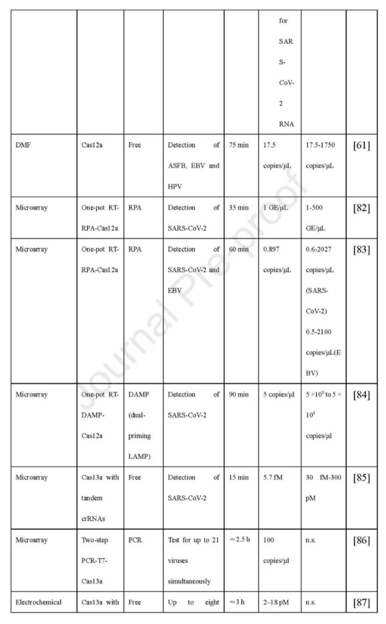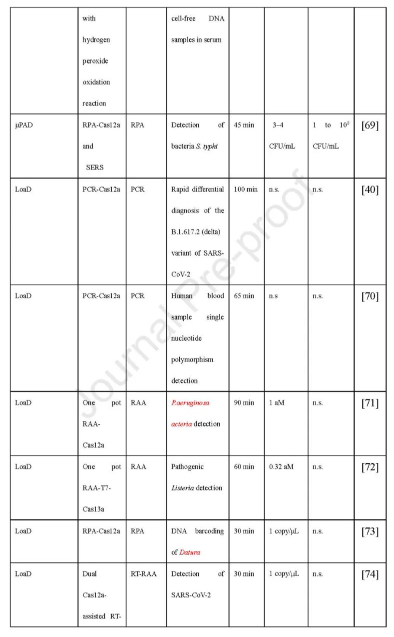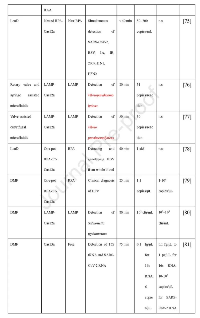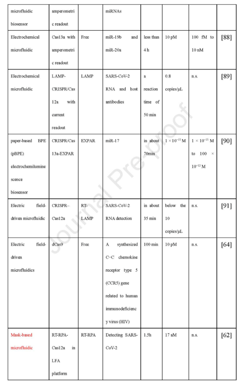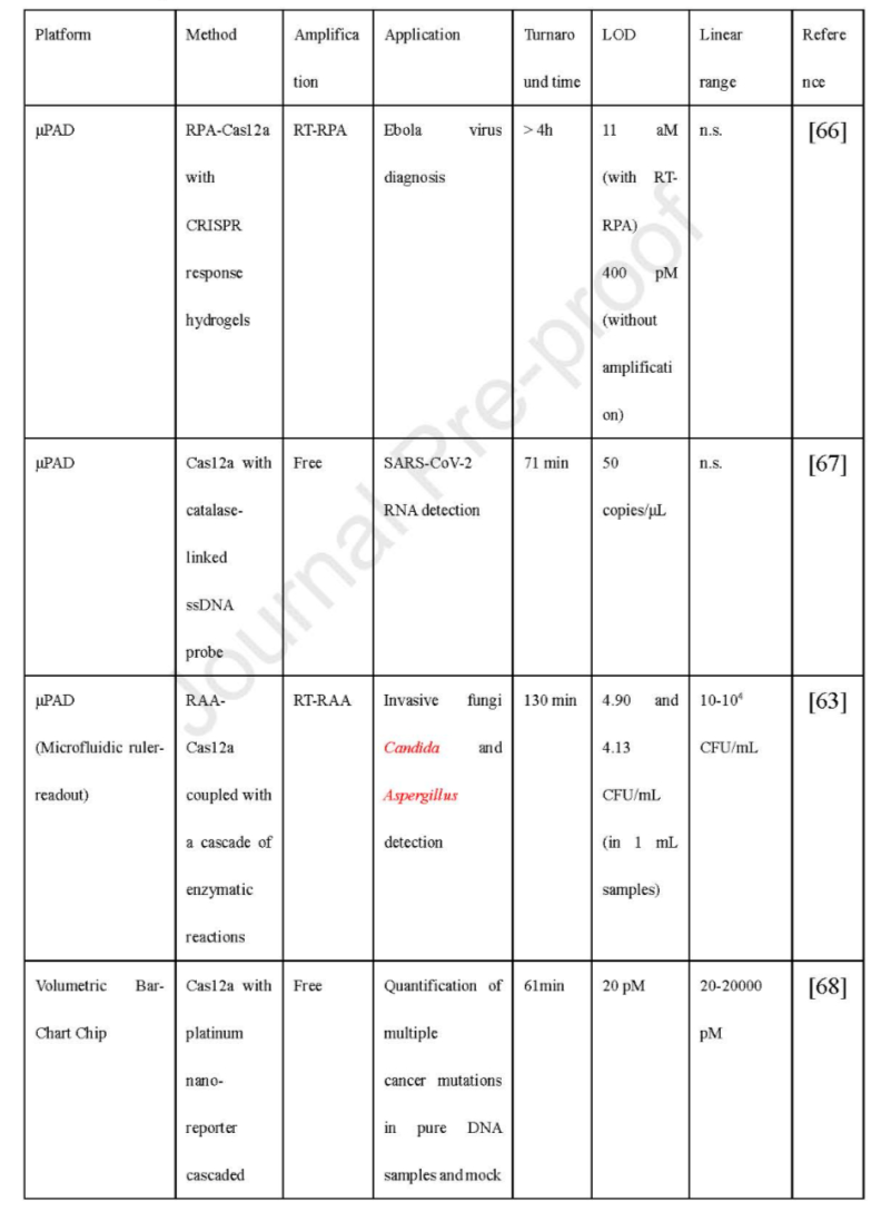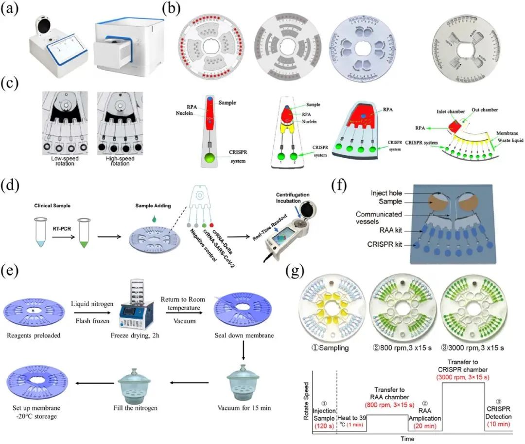 1 1. CRISPR系统和微流控技术 1.1 CRISPR系统 作为新兴的基因编辑和调控工具,CRISPR系统具有高度的特异性、灵敏度和灵活性。除在基因编辑和改造方面有重要作用外,在传染病诊断、环境监测、食品安全检测等方面也有着良好的前景。随着CRISPR/Cas系统的深入研究,通过其高特异性识别目标序列和反式切割能力,已经建立了多种简便、灵敏的生物传感平台,解决了传统方法在操作、灵敏度、特异性及检测周期方面存在的不足[2]。 CRISPR/Cas系统由于优异的生物传感性能逐渐成为下一代诊断技术的焦点,有望成为开发理想诊断产品的方法。基于CRISPR/Cas系统的特异性结合活性和高效反式切割能力,将其与电化学、荧光传感技术相结合,已经成功实现了各种靶标分子的检测,检测对象也已经从最初的核酸扩展到金属离子、蛋白质、细菌、小分子等,说明了CRISPR/Cas系统在检测领域具有通用性。 1.2 微流控技术 微流控技术的概念被提出已有30余年,以“微型全分析系统”(μ-TAS)和“芯片实验室”(LOC)为主要形式。随着微流控技术的日臻成熟,逐步从前期技术攻关进入到产品商业化研发阶段,具有消耗试剂少、检测速度快、易于集成等优势,为其在临床检验领域提供了巨大的发展机遇[3]。 微流控技术指的是在微米尺度下对微小量级的流体进行精准操控的一种技术,可以实现多个实验流程在一块芯片上自动完成,具有低消耗、高效率、自动化、集成化、便携化等优势[3]。 在COVID-19大流行背景下,微流控技术在SARS-CoV-2即时检测中发挥了非常重要的作用,包括与核酸分析、免疫测定、电化学生物传感器等相结合的方法。微流体系统是自动操作装置,包含允许液体流动(10-100μm)的微通道,以及其他几个组件,包括微型泵、微型入口阀和微型出口排水管,以及用于分析内容物的不同设备。与传统的生物分析方法相比,它们有几个优点:(a)试剂消耗量少;(b) 成本效益高;(c) 操作简单,对训练有素的人员的需求较少;(d) 周转时间快,适合紧急诊断;(e) 样品产生较少的污染。(f) 检测通量高。此外,微流控系统可以成为各种经典检测方法的通用平台,例如核酸分析,免疫测定,电化学方法,光化学方法、表面增强拉曼测定等。微流控检测方法似乎在未来继续快速发展,微流控平台有可能将基于CRISPR的技术提升到生物分析和临床诊断领域的新水平。本篇文献[1]作者讨论CRISPR-微流控的最新进展和应用,主要集中在微流控系统如何在降低成本、抗污染、操作简单、可视化、灵敏度和量化方面改进基于CRISPR的技术(图1)。 图1:基于CIRSPR的微流体的一般应用 2 2. 基于CRISPR的微流控系统检测方法概述 基于CRISPR的技术和基于微流体的系统在生物分析和临床诊断方面都具有出色的性能。下列表1,概述了基于CRISPR的微流控检测方法的最新进展【1】。 表1:最近基于CRISPR的微流控检测方法综述。检测限不能总是在各研究中直接比较,特别是因为一些研究没有报告LOD是如何确定的。n.s. 表示文章中未指定。μPAD是指基于纸张的微流控分析装置。LoaD 表示光盘上的实验室。DMF 表示基于液滴的微流体。 举例1:基于CRISPR的离心微流控系统,用于全封闭和集成分析(文献[1]作者团队的产品) 21世纪初,离心微流控平台的发展迎来了爆发式的进步。离心微流控芯片,也称为光盘实验室(LoaD),集成了试剂,混合,流量控制,反应和结果输入。LoaD最重要的功能之一是由离心力驱动的精确流量控制。离心微流控系统一般包括离心驱动源组件、液体分配通道、液体混合室、阀门控制系统、试剂储存室、反应室、信号输出装置等,自动实现样品预处理、纯化、反应和信号输出于一体。离心微流控芯片已经在免疫测定,生化分析和分子诊断领域表现出优异的性能。 离心式微流体系统有几个优点:(a)由于严格的模块分离和密封,交叉污染的风险最小。(b) 试剂消耗少,降低了成本。(c) 无需任何额外的手动操作即可实现进样和出样。(d) 它是一种通用检测平台,受样品特性(如密度、pH、电导率等)的影响较小。(e) 通过合理设计微通道可以实现多重检测。(f) 在一次芯片测定中,可以依次进行多个级联反应,而不会相互影响。 到目前为止,大多数CRISPR检测方法都包含两个以上的步骤(提取,扩增和CRISPR检测)。在传统的CRISPR试管方法中,交叉污染和系统不相容是不可避免的,阻碍了其广泛应用。由于离心微流体系统的几个优点,它们是进一步利用CRISPR技术在临床应用中应用的有希望的候选者。 [1]复旦大学化学系孔教授课题组开发了一套用于生物分析和分子诊断的离心微流控平台(上海速芯生物微流控平台)。该平台包含多个模块,包括样品预加载、多个区域的精确温度控制、离心驱动模块、荧光信号采集和实时信号输出(图 2a)。该芯片主要由加样室、微通道和反应室组成。它可以同时检测4/8/16/32个样品,每个样品分为8/4/2/1反应室进行平行检测(图2b)。 如图 2.(a)该研究小组设计的辅助微流控装置。(b)微流控芯片的详细结构和流体通道。(c)样品液体在芯片中的流动阶段随着转速和时间的增加。(d)用于快速鉴别诊断SARS-CoV-2德尔塔变体的自动化Cas12a平台示意图。(e)长期储存过程包括冷冻干燥、密封、氮气保护和低温储存步骤。(f)双CRISPR / Cas12a辅助RT-RAA系统芯片中每个测试单元的结构和详细功能。(g)微流控芯片的工作流程和用颜色标记的芯片中微流体的状态[