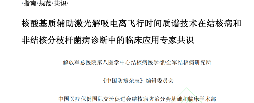 文章来源:《中国防痨杂志》网络首发论文 作者:梁建琴,吴雪琼,安慧茹 DOI:10.19982/j.issn.1000-6621.20230113 摘要 核酸基质辅助激光解吸电离飞行时间质谱(matrix-assisted laser desorption ionization–time of flight mass spectrometry,MALDI-TOF MS)技术在结核病与非结核分枝杆菌病病原学和耐药性诊断中的应用越来越多,为早期诊断、鉴别诊断和耐药鉴定提供了快速、准确的依据。然而,在实际应用中,临床医生对标本的选择、留取、送检时机及注意事项、报告结果的解读等的理解和掌握参差不齐,尚需规范化。本共识总结了核酸MALDI-TOF MS检测技术应用于结核病和非结核分枝杆菌病诊断的临床适应证和标本采集注意事项,介绍了如何正确解读核酸MALDI-TOF MS技术鉴定分枝杆菌菌种和耐药性的报告结果,以进一步规范核酸MALDI-TOF MS技术在结核病和非结核分枝杆菌病诊断中的临床应用,提高临床诊断水平,指导临床开展早期精准有效的治疗。 第一部分 核酸基质辅助激光解吸电离飞行时间质谱技术 基本原理与特点 第二部分 共识制定的过程 第三部分 核酸MALDI-TOF MS技术鉴定分枝杆菌菌种 及其耐药性 目前,核酸MALDI-TOF MS技术可鉴定结核分枝杆菌复合群8个亚种和40个NTM菌种及其亚种,合计48个分枝杆菌菌种和亚种(表2),几乎覆盖了临床上分枝杆菌病的所有常见致病菌,可以满足临床实现快速鉴定分枝杆菌菌种的要求,为临床医务人员提供诊断参考。另外,随着临床实践的逐步积累,核酸MALDI-TOF MS技术可根据临床上未来可能出现的菌种予以增加鉴定。 第四部分 应用核酸 MALDI-TOF MS 技术检测分枝杆菌病 的临床适应证和送检时机 推荐意见1:近期具有明确的肺结核密切接触史,咳嗽、咳痰超过2周,伴或不伴有咯血、胸痛、胸闷、气短等呼吸道症状和低热、盗汗、乏力、体质量减轻等全身中毒症状,临床常用结核病病原学检查结果为阴性,影像学检查存在肺部病变,需快速确诊的患者,建议送痰和支气管肺泡灌洗液进行培养的同时送核酸MALDI-TOF MS检测,可在1~2 d内快速鉴定病原菌以明确诊断。 推荐意见2:胸部影像学表现高度怀疑肺结核,γ-干扰素释放试验(interferon-gamma release assays,IGRA)阳性,结核菌素皮肤试验(tuberculin skin test,TST)强阳性或重组结核杆菌融合蛋白(EC;宜卡®)阳性,临床常用病原学检测阴性,诊断性抗结核治疗效果差,适合送MALDI-TOF MS检测,可快速明确诊断。 推荐意见3:疑似结核性胸膜炎患者,胸腔积液常规结核分枝杆菌细菌学检查阳性率低,建议按要求送胸腔积液进行核酸MALDI-TOF MS检测以提高病原学检出率。 推荐意见4:疑似肺外结核,如结核性脑膜炎、结核性淋巴结炎、骨关节结核、肠结核、结核性腹膜炎、泌尿生殖系统结核、结核性心包炎、皮肤结核等肺外结核患者,治疗效果差,分泌物和(或)活检、手术组织临床常用病原学检测阴性时,适合送核酸MALDI-TOF MS检测。 推荐意见5:胸部影像学表现高度疑似NTM肺病,尤其是IGRA阴性和EC皮肤试验阴性,TST阳性者,适合及早送痰和(或)支气管肺泡灌洗液进行核酸MALDI-TOF MS检测。 推荐意见6:慢性肺部疾病,包括肺囊性纤维化、支气管扩张、慢性阻塞性肺疾病、尘肺、肺间质纤维化、支气管哮喘、过敏性肺炎、变应性支气管肺曲霉菌病等患者,经规范性治疗效果差,尤其合并免疫功能受损,如艾滋病病毒(human immunodeficiency virus,HIV)感染/艾滋病(acquired immune deficiency syndrome,AIDS)和器官移植等长期服用免疫抑制剂的患者,高度怀疑并发肺结核或NTM肺病时,适合送核酸MALDI-TOF MS,以快速鉴定病原菌及其耐药性。 推荐意见7:对外伤或手术,包括医疗美容手术后出现局部皮肤反复感染,伤口经久不愈的患者,建议送伤口分泌物进行核酸MALDI-TOF MS,排除NTM感染。 推荐意见8:确诊NTM病,包括NTM肺病和肺外NTM病的患者,需要明确感染菌种对药物的敏感性,可进行核酸MALDI-TOF MS检测。 推荐意见9:复治肺结核和肺外结核,抗结核药物治疗效果不佳或者病情复发,高度怀疑耐药的患者,进行痰、分泌物、活检及手术组织表型和基因型药敏试验的同时,可送核酸MALDI-TOF MS进行耐药性检测;高度怀疑异质性耐药者,可在治疗过程中进行核酸MALDI-TOF MS耐药性检测跟踪。 推荐意见10:肺结核和肺外结核诊断明确,痰、分泌物和(或)活检、手术组织GeneXpert MTB/RIF检测利福平耐药的患者,建议送核酸MALDI-TOF MS检测结核分枝杆菌对其他一线和二线抗结核药物的耐药性。 推荐意见11:对于鸟分枝杆菌、胞内分枝杆菌和脓肿分枝杆菌等致病性NTM,建议送核酸MALDI-TOF MS进行耐药性检测;对于弱致病性的NTM,可根据送检样本来源、临床症状和影像学表现,决定是否进行核酸MALDI-TOF MS检测其耐药性。 第五部分 标本的采集、运输、检测及实验室质量控制、 出具报告 1.采集标本容器:收集临床标本的容器内需含有分枝杆菌灭活剂成分。 2.采集标本信息:收集标本的容器上应标注患者信息、标本类型、送检科室等信息。送检标本应有送检申请表,填写受检者信息,包括编码、采样日期、个人基本信息、标本类型、采样单位等。采样人员在采样前及采样后均需仔细核对受检者信息。 4.采集标本时:不同类型的生物标本采集,必须由经过培训且考核合格的专业人员进行规范操作,严格执行无菌操作,避免标本污染;对高度怀疑分枝杆菌病者,建议送检2份以上同类型或不同类型的样本;其他肺外结核样本最好采集自病灶处;呼吸道样本