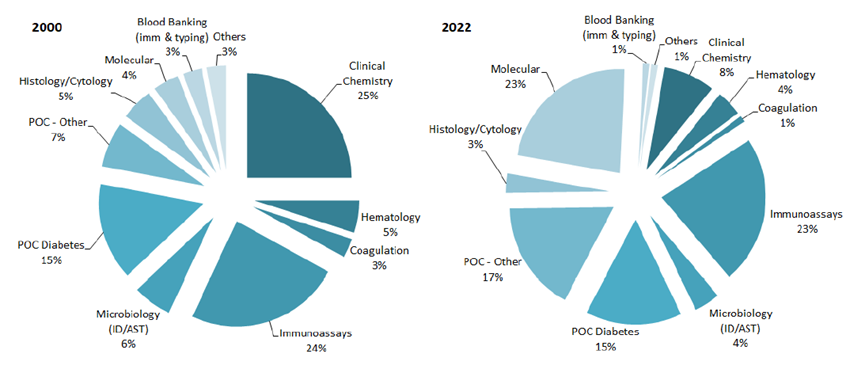 2000 年和 2022 年按细分市场、百分比划分的 IVD 市场份额比较