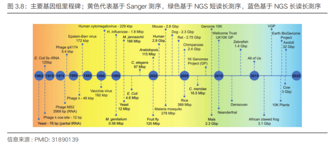 NGS 在纳米级空间内进行 PCR 反应来扩增 DNA(ONT 等不需用到 PCR),基于大规模平行的反应产生巨大数据量。单位反应产生的数据量逐年提高,成本超摩尔定律下降,目前全基因组测序(30x)成本低于 500 美元。极大推动了人口级大规模基因测序基础研究,对于将基因技术应用到临床辅助诊断及伴随诊断、新药研发、病原溯源等作出了重要贡献。此外,随着 PacBio 的 SMRT 技术优化,复杂物种以及微生物的 de novo 组装得以突破,推动生物多样性研究;ONT 的 Nanopore 测序技术不依赖 PCR,最长读长超过 4 Mb,结构变异检测日趋成熟;其便携式设备也让测序从实验室到野外,从地球到太空展开更广阔的应用场景。■ 局限