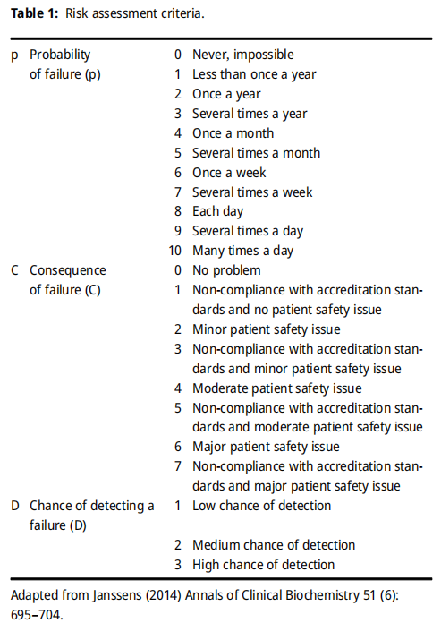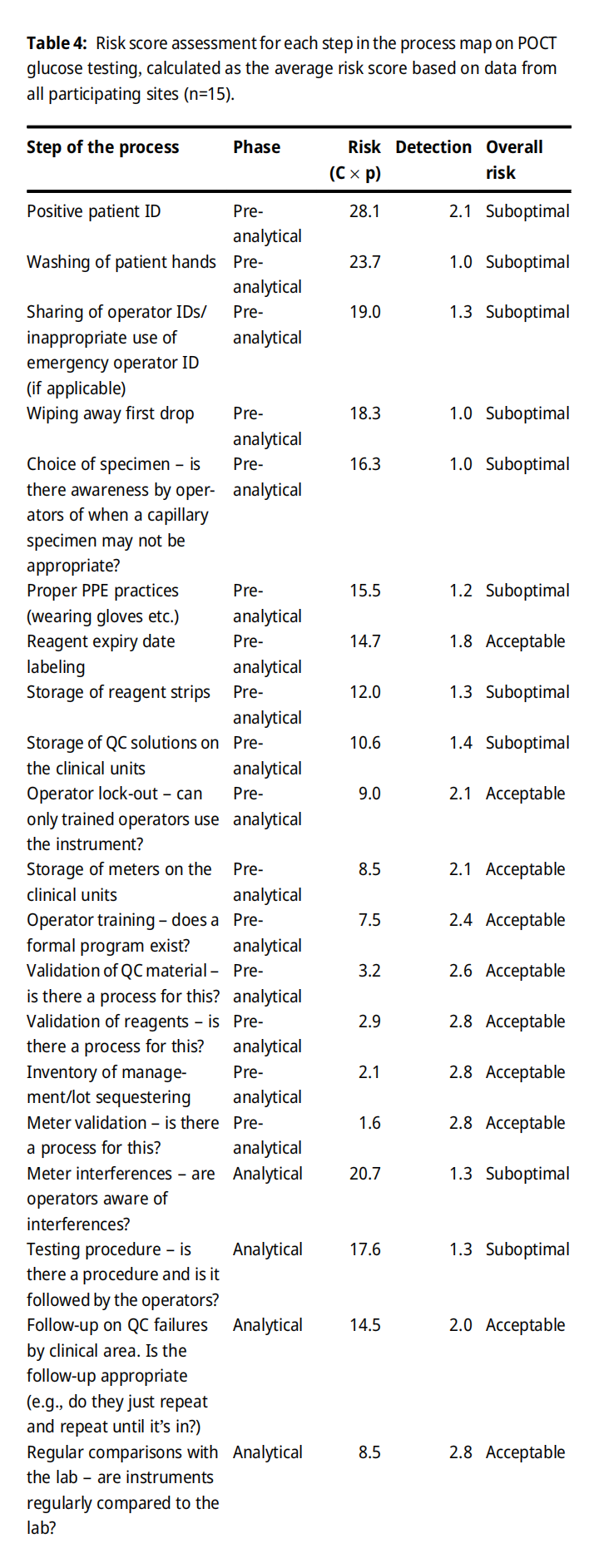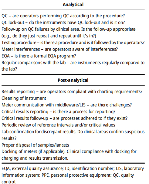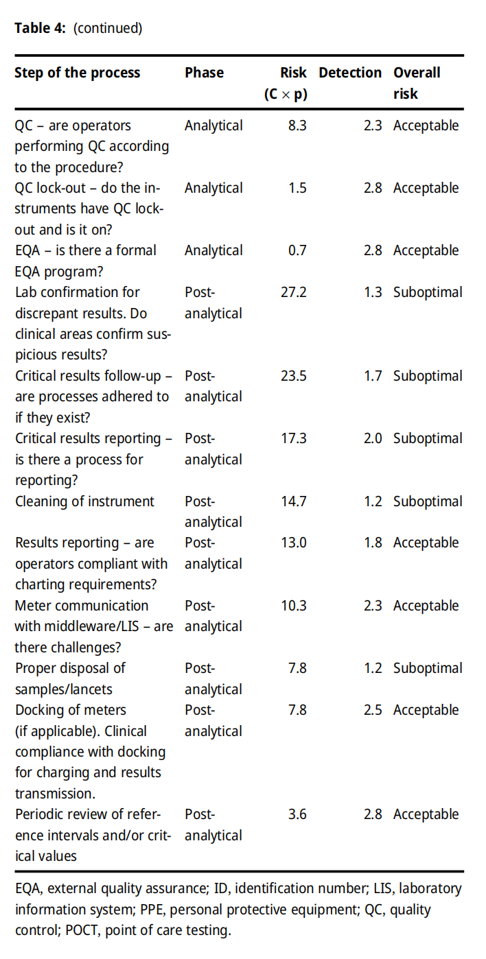 5月29日国家卫健委、国家中医药局印发《关于开展全面医疗质量行动(2023-2025年)的通知》,本次行动范围为全国二级以上医疗机构,各级各类医疗机构是行动的责任主体,医疗机构主要负责人是第一责任人。三年行动工作任务明确,提出了三大方面,28项具体措施。其中第17条提到“重点关注即时检验(POCT)质量管理”。恰好,近期《Clinical Chemistry and Laboratory Medicine》杂志刊载了一篇关于POCT质量管理相关内容的文献(《Establishing quality indicators for point of care glucose testing: recommendations from the Canadian Society for Clinical Chemists Point of Care Testing and Quality Indicators Special Interest Groups》)。作者采用前瞻性的风险失效模式和效应分析,对POCT的潜在质量指标(QI)进行优先排序。来自加拿大9个省的22名临床生化学家对POCT分析前、分析中和分析后的全过程步骤进行分析,基于风险发生的概率、发生的后果、发现的机会来评估每一步的风险,每个步骤的风险评分是通过将失效的概率(0-10)乘以失效的结果(0-10)来计算的。每个步骤的总风险计算为所有参与医疗机构计算的平均值。在每个步骤中,检测到失效的总体机会(分为1-3级)被计算为所有参与医疗机构的平均结果。作者根据Janssens等人推荐的标准把每个步骤被分类为“可接受”、“次优”或“不可接受”。该过程中每个步骤的总体风险评分是根据所有参与医疗机构提交的数据确定的(n=15)。最终依据风险得分确定了POCT血糖检测过程中最容易出错的环节,最重要的两个质量指标分别是阳性患者信息识别和极高血糖值重复检测。为了验证这两个质量指标的作用,作者使用建立的方法对加拿大57家医疗机构提供的一个月的POCT血糖仪数据进行了分析,无效PPID(阳性患者身份)进行了POCT血糖检测的百分比范围为0-87%,在没有关联入院-出院-转移(ADT)信息到POCT仪的医疗机构中,该比例为26-87%,而在有ADT信息关联的的医疗机构中,该比例为0-67%,差异有统计学意义。这说明了信息关联的重要性,也表明实践中对该建议的依从性较低,同时患者结果不会记录在他的病历中。另外,作者发现部分医疗机构没有按照要求对极高值的POCT血糖结果进行重复检测验证,同时也发现极高值的POCT血糖重复检测的结果中有较高的不一致率(10分钟内两次检测结果大于20%),这些数据表明了在胰岛素给药前重复检测的重要性。作者的研究结果表明质量指标对在不符合项的识别和性能监测中发挥了重要作用,能够显著提高医疗机构POCT的质量控制水平。