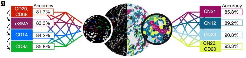 高度多重成像想转化为临床测定方法暂时不可行。因此,研究团队试图在不影响预测准确性的情况下确定可用于预测进展的标记物。发现五个标记CD14、CD16、CD94、αSMA和CD117的组合导至90.8%的准确率(下图g)。当添加CD20(B细胞marker)时,准确率提高到93.3%,精确度和召回率分别为95.6%和95.6%。总的来说,这些数据表明,空间分辨率的单细胞数据集在未来可能非常有价值。