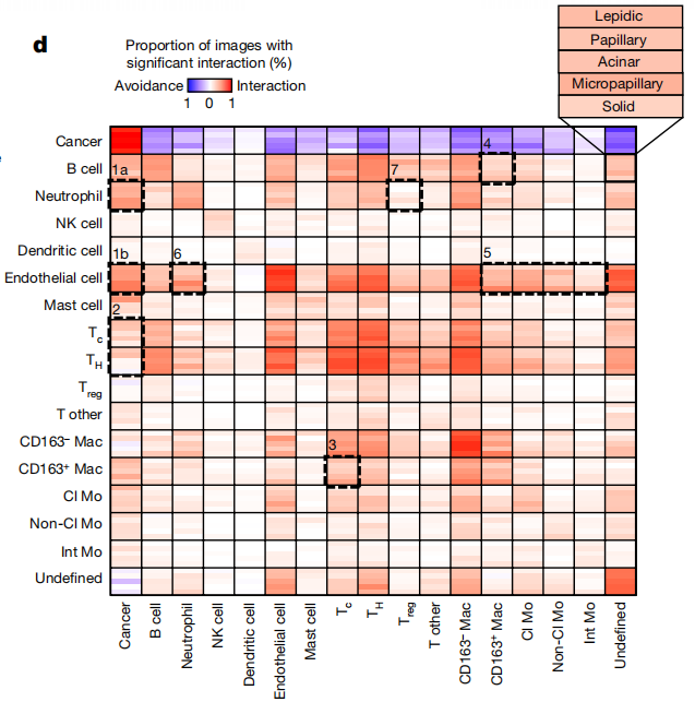 研究团队通过量化细胞-细胞的空间关系来表征单个细胞之间的直接相互作用和通信模式。结果表明细胞-细胞相互作用的空间关系比单独的细胞频率具有更大的预后价值。与低级别亚型相比,在实性和微乳头状亚型中,中性粒细胞和内皮细胞与癌症细胞的相互作用都有增加的趋势(图d),与中性粒细胞促进血液源性转移相一致。