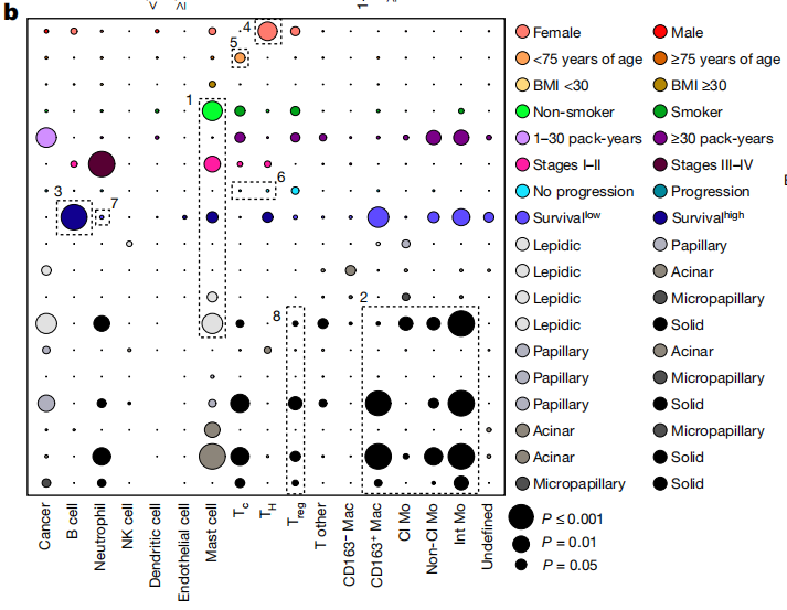 评估免疫群体与临床或病理变量(性别、年龄、体重指数(BMI)、吸烟状况、分期、进展、生存率和组织学亚型)之间的关系(如下图b)。尽管肥大细胞与延长生存期有关,但它们在非吸烟者、早期患者和鳞状肿瘤患者中的比例过高。相比之下,B细胞频率与更好的总生存率最显著相关,与任何临床或病理变量无关。