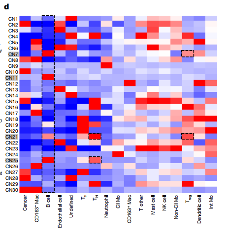 鉴于B细胞的预后价值,研究团队更详细地分析了B细胞邻域(cellular neighbourhood, CN)。在四个B细胞富集的邻域(CN7、CN11、CN21和CN25)(下图d)中,当CNs同时显示Treg细胞(CN7和CN21)富集时,与B细胞相关的生存优势被抵消;而当Treg细胞较低时,CN11和CN25保持了生存优势。数据表明,CN25生存相关性的改善与B细胞和CD4+辅助T细胞的相互作用有关,而Treg细胞的富集仍然足以抵消这种生存益处,强调了多细胞在TIME相互作用的重要性。