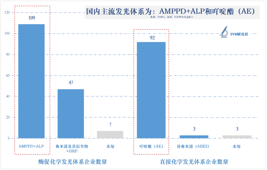 先来看个全貌。国内309家化学发光企业,湖南52家,占17%;广东48家,占16%;北京33家,占11%;江苏32家,占10%;浙江和上海,均为23家,各占7%;山东17家,占5%;天津12家,占4%;重庆11家,占4%;河南和四川,均为8家,各占3%;福建、湖北、安徽3省均为7家,各占2%;广西和河北各5家,分占2%;江西和陕西各3家,占1%;吉林2家,云南、黑龙江、贵州各1家。这些数据,包含国产、进口,也包括子公司在内。湖南化学发光企业数TOP1,主要是其他省市企业,到长沙、湘潭、常德等地注册了子公司。这309家发光企业,都用哪种发光体系呢?超过一半的企业,采用酶促(间接)化学发光法,163家,占53%;有1/3的企业,采用直接化学发光法,98家,占32%;电化学发光8家,仅占2%;光激化学发光6家,仅占2%;直接法、酶促法都兼容的,有8家,占3%,主要是化学发光CMDO/OEM企业;另外还有25家,未准确表述自家产品化学发光体系的,黄工查询药监局数据库、企业官方公众号、专利数据库等,均未获取到发光体系有关信息。对上图进一步分析,目前国内主流发光体系(发光底物+标记物)为:AMPPD+ALP和吖啶酯(AE)。163家采用酶促化学发光的企业,有109家的发光体系为AMPPD+ALP(碱性磷酸酶),占66.87%;98家采用直接化学发光的企业,有92家的发光体系为吖啶酯(AE),占93.88%。 大家都知道,化学发光是封闭系统,有仪器投放医院,是试剂上量、持续盈利的根本支撑。那这309家企业,仪器/试剂业务,各家都是怎样的呢?总的看,309家化学发光企业中,注册有仪器的166家,占53.72%;注册有试剂的254家,占82.2%;同时拥有化学发光仪器和试剂的,则有116家,占37.54%。 那合并子公司,实质运营的化学发光企业主体(母公司),以及国内化学发光版图是怎样的?以下内容,是本文的核心。我们将会看到,目前国内IVD最大市场份额,化学发光赛道都有哪些实力玩家。信息整理,难免有错漏,还望相关厂家朋友,多多包涵,多多指正。