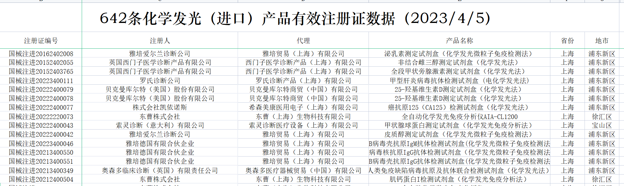 花了一个多月时间,终于把国内化学发光有效注册证数据,全部整理、清洗好了。到2022年12月31日,国产化学发光注册证共6968张;到2023年4月5日,进口化学发光注册证642张。两者加总,目前国内化学发光注册证,大约7600张,包括仪器、试剂、质控品、校准品等。去年统计的国产注册证,到2023Q1可能有增有减,但数据差异不会太大也不影响本文论述。这7600张注册证,登录国家药监局数据库,医疗器械板块,输入“化学发光”整理可得。(↑:目前国内化学发光有效注册证数据,国产+进口,总计7600条)基于上述数据,梳理出国内市场,化学发光相关企业共309家。这309家企业,包括子公司在内,很多不仅从事化学发光业务,也有IVD其他板块的,但都和化学发光有关,就一并整理了。另外,还对这309家企业,成立时间、所属省区市、母公司(控股公司)、业务包含仪器/试剂、发光体系等重要内容,做了进一步的分析整理,基于此表,可一览全国化学发光版图。(需要上表的朋友,可加入文末黄工的知识星球,有很多干货资料供下载,有技术群供交流)